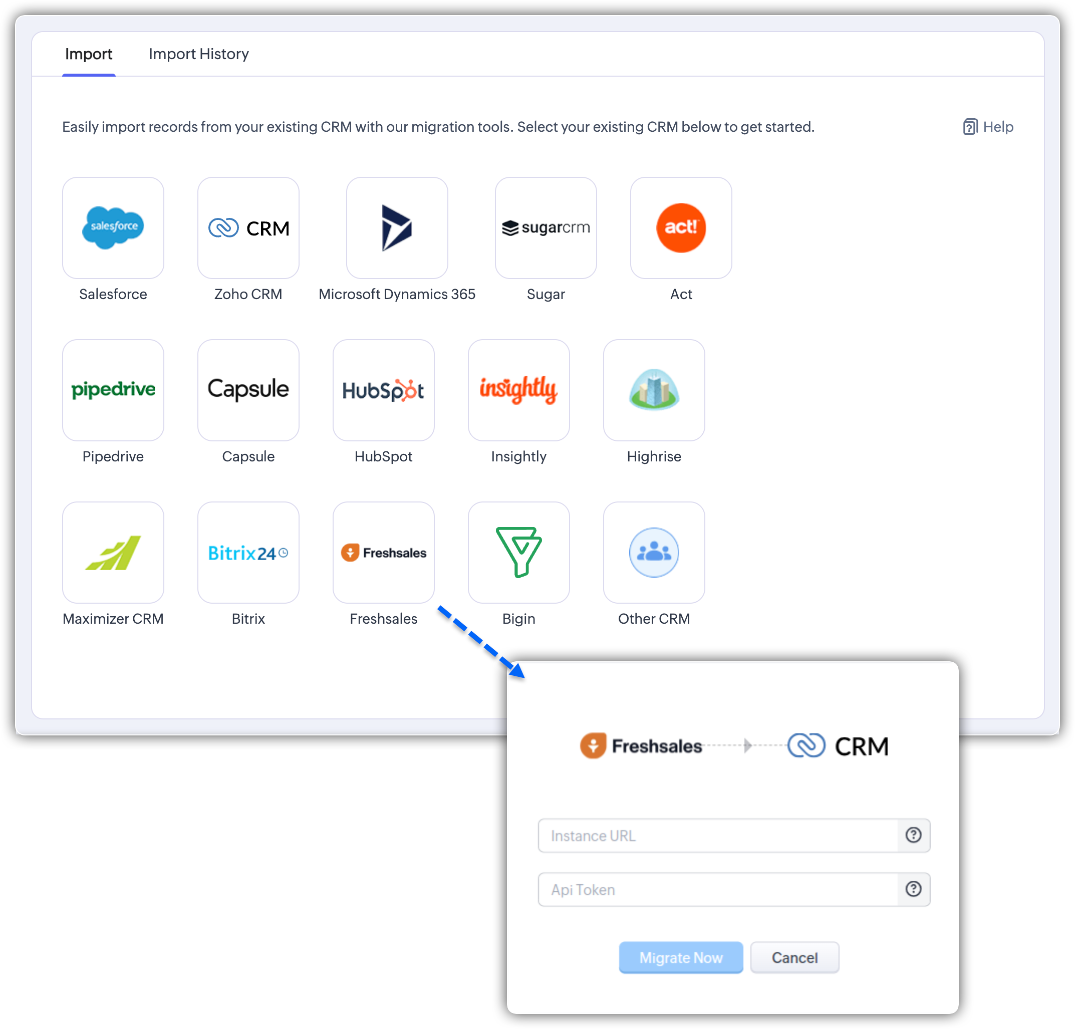 You can migrate your data from Freshsales to Zoho CRM using the API token and instance URL. The entire migration runs in the background, and once it’s complete, you’ll receive an email confirmation. You can undo or re-run the migration up to three times, if needed.