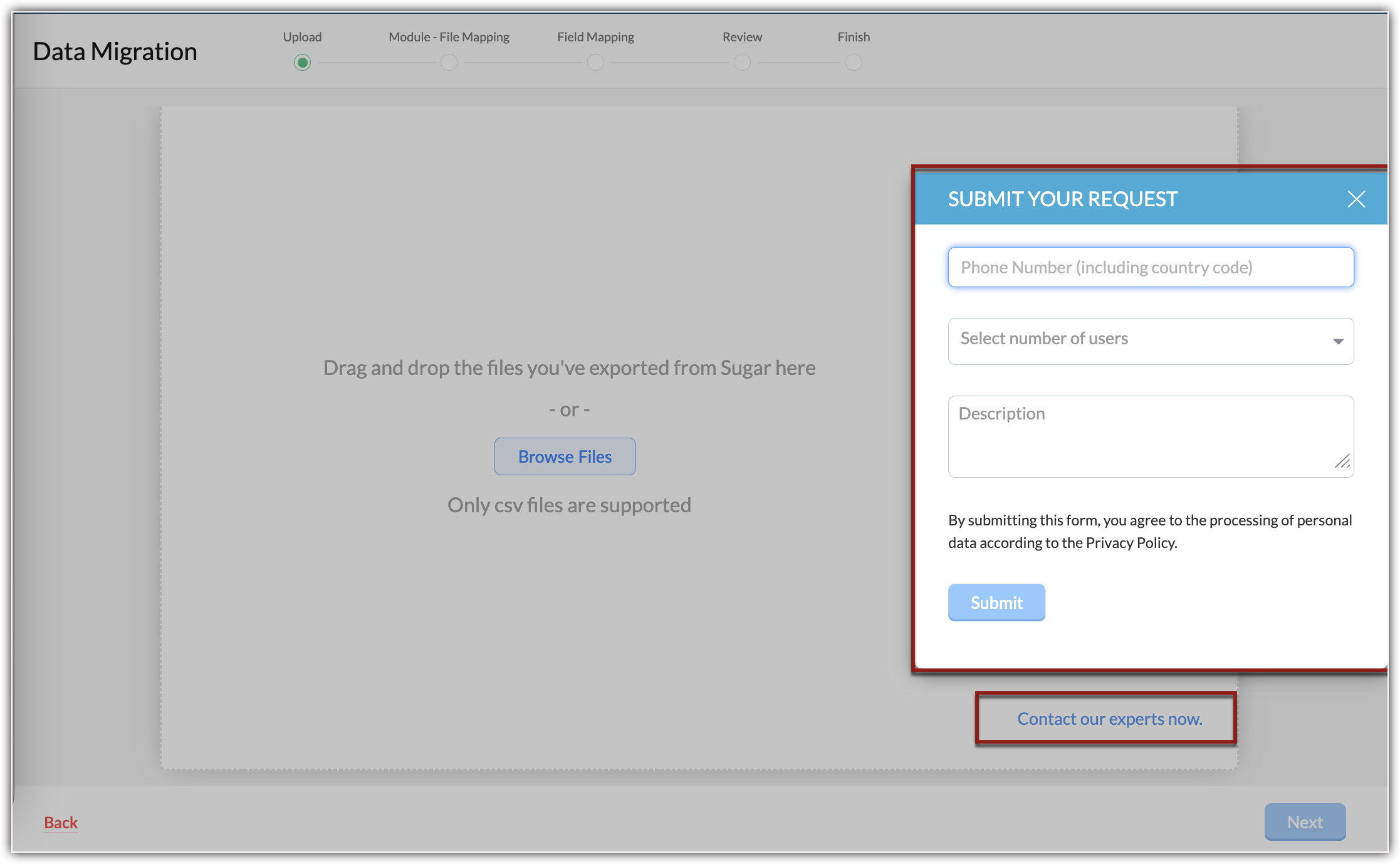 2. On the Data Migration page, click on the Contact our experts now call-to-action button.