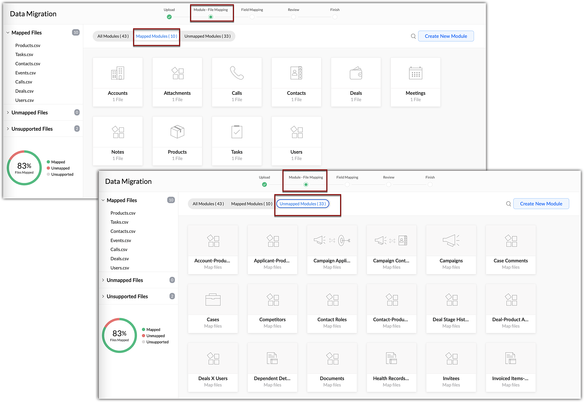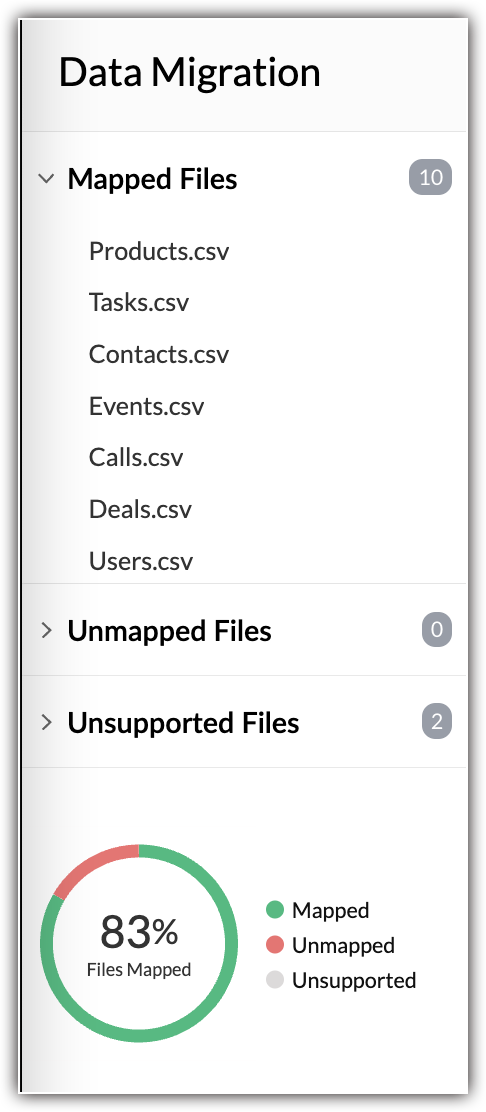 The Data Migration wizard in Zoho CRM ensures that your data is migrated accurately and helps you reduce much of the manual work. It automatically maps import files to CRM modules and import file columns to Zoho CRM fields. In the case of modules ...