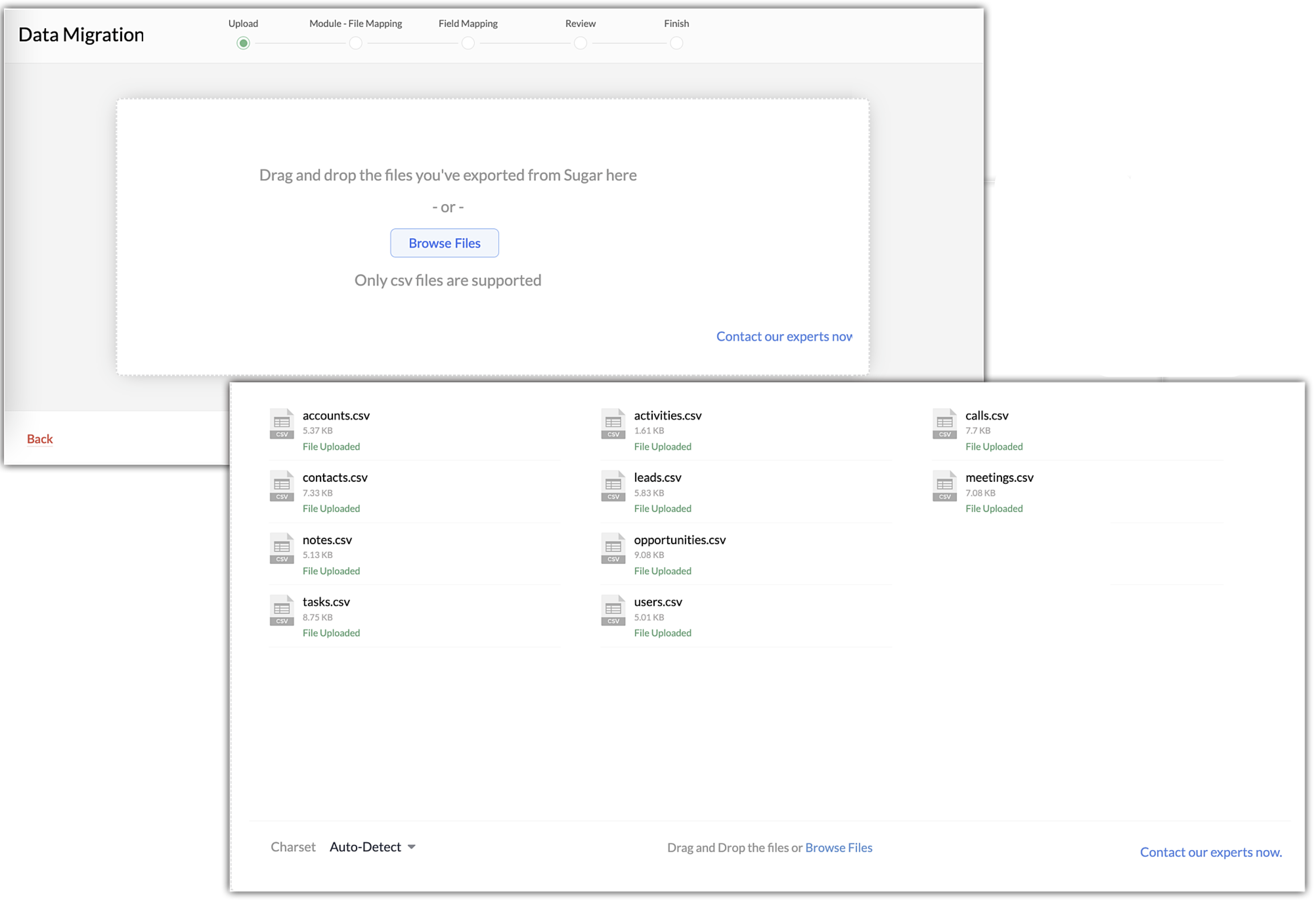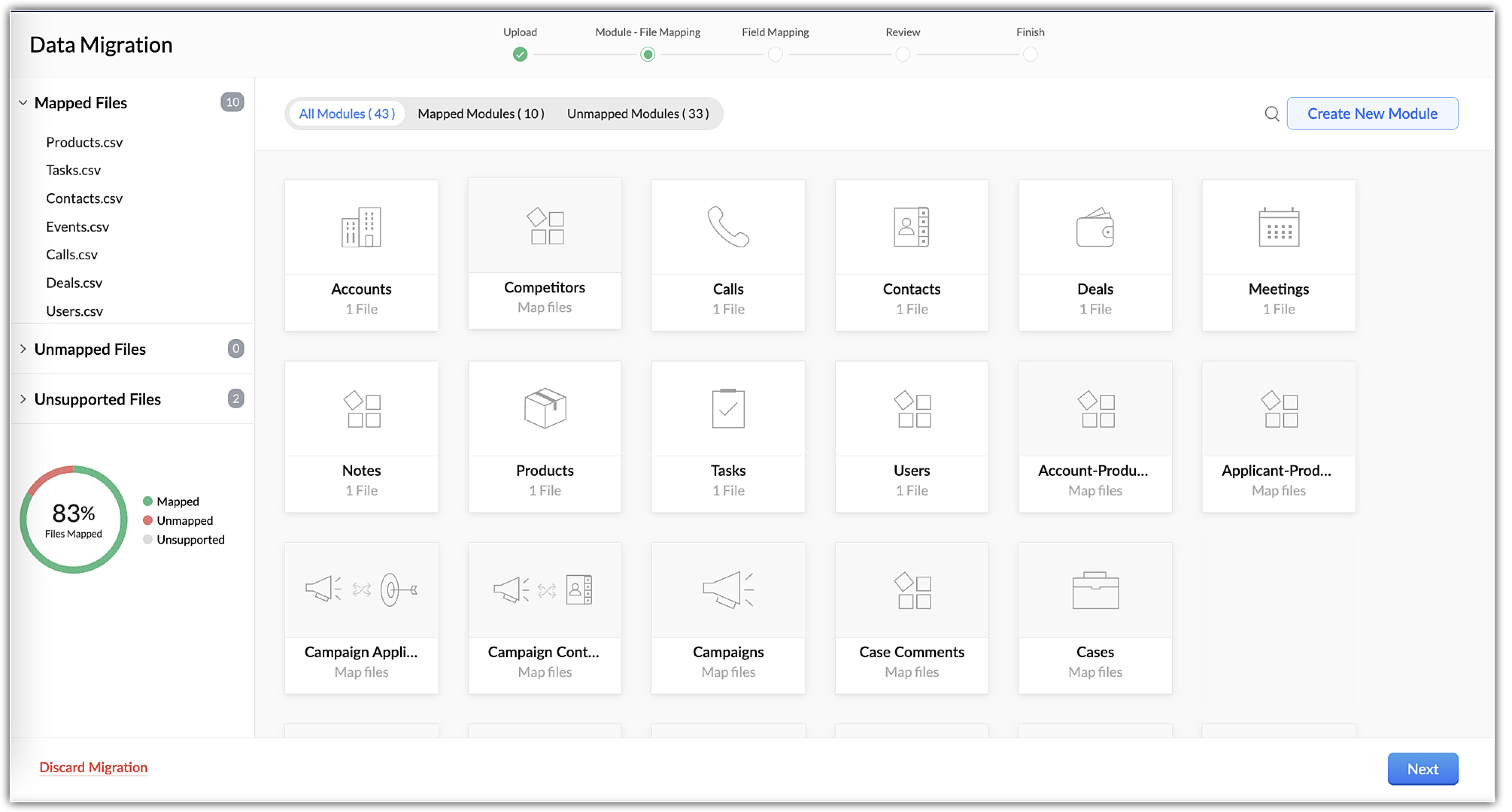 5. Click Next. Zoho CRM automatically reads the files and maps the data to the correct modules and fields.