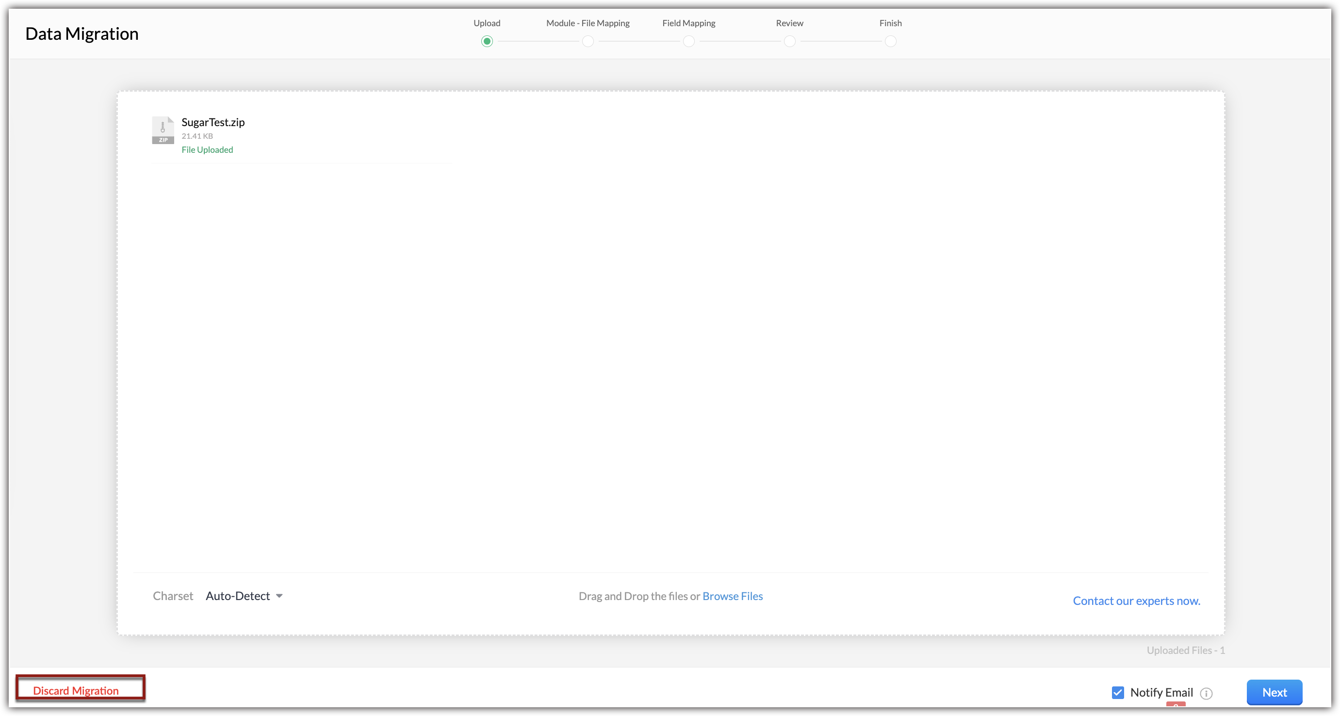 You can select multiple files or upload a zip file to migrate data into more than one module.