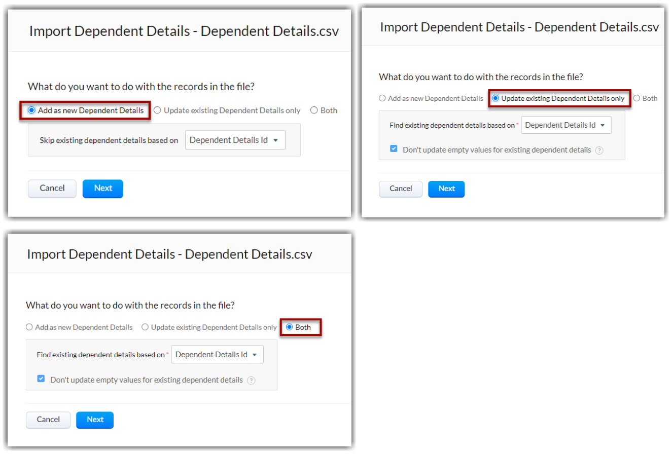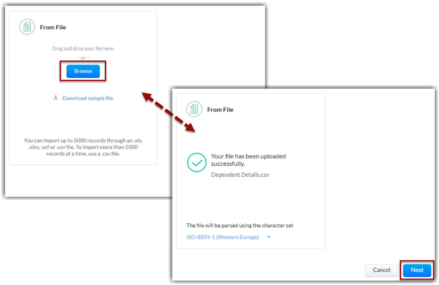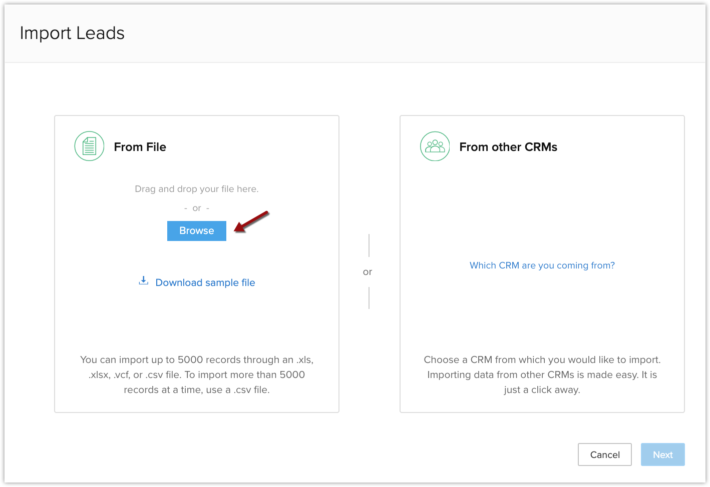 If the import file is in .XLS, .XLSX or .VCF format, you can import a maximum of 5000 records/batch for all CRM editions. However, to import more than 5000 records/batch your import file must be in .CSV format only, and the maximum number of records that you can import will vary according to your subscription.