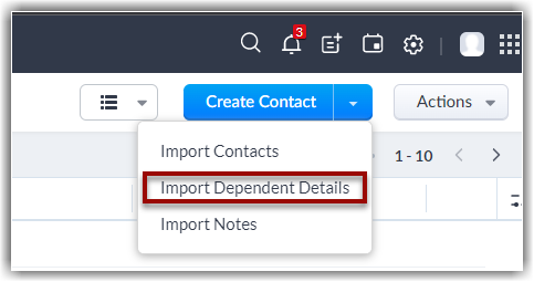 In the Module home page, click Import Subforms from the Create Contact dropdown.