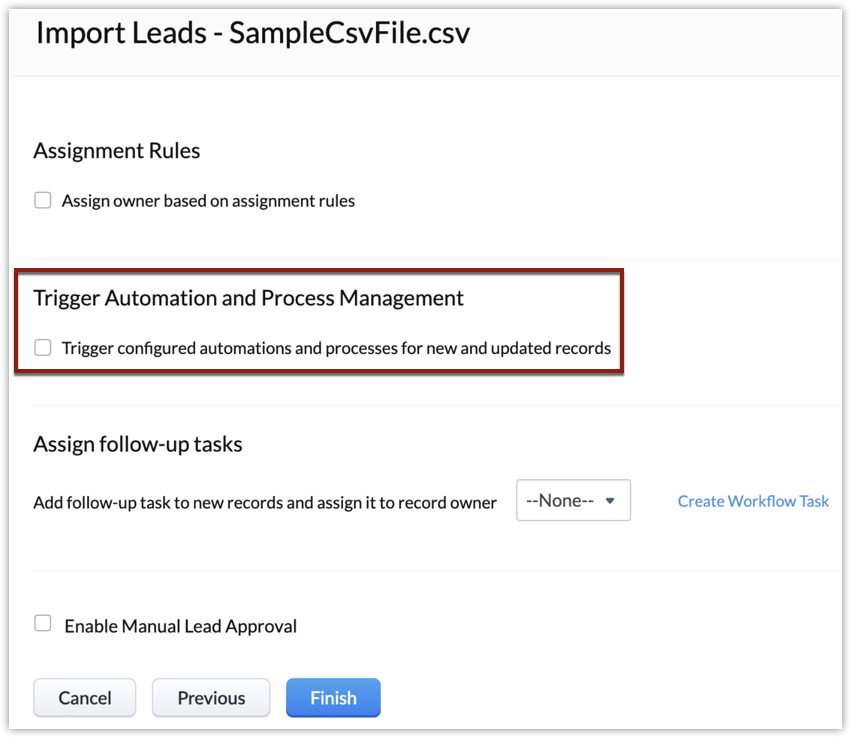 The Trigger automation and process management option will be displayed only if there are less than 10,000 rows in the import file. If you are unable to view the option it means your import file has more than 10,000 rows.