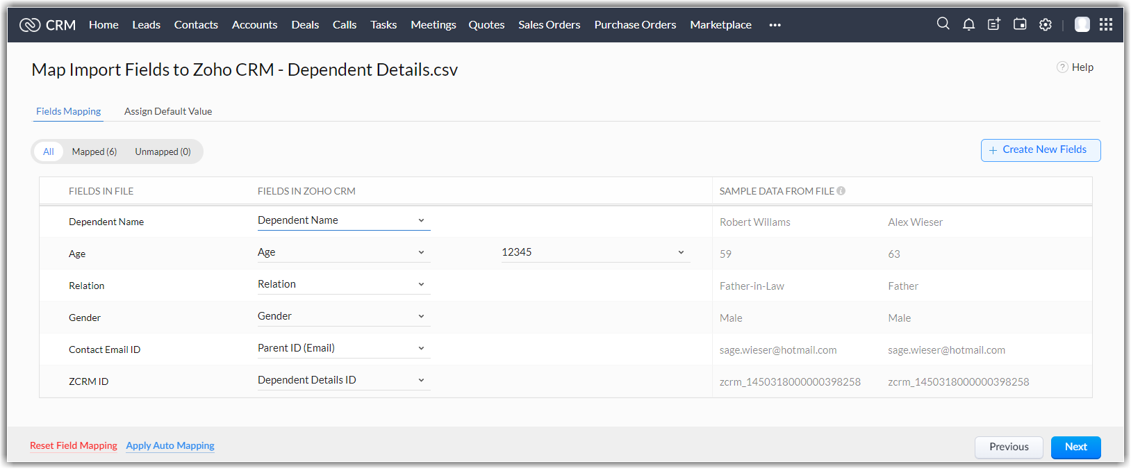 Map the fields from the import file to those in the subform in Zoho CRM.