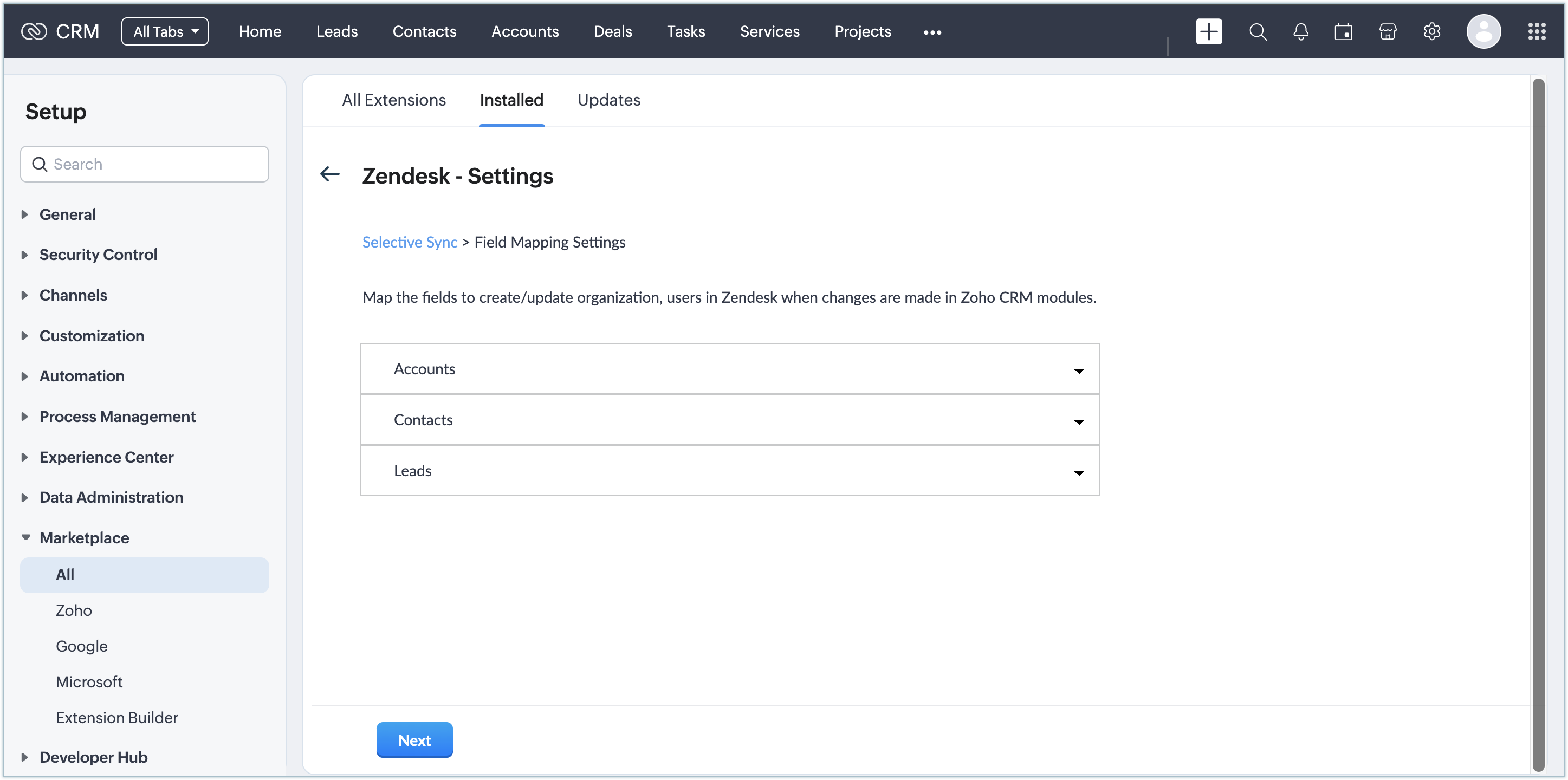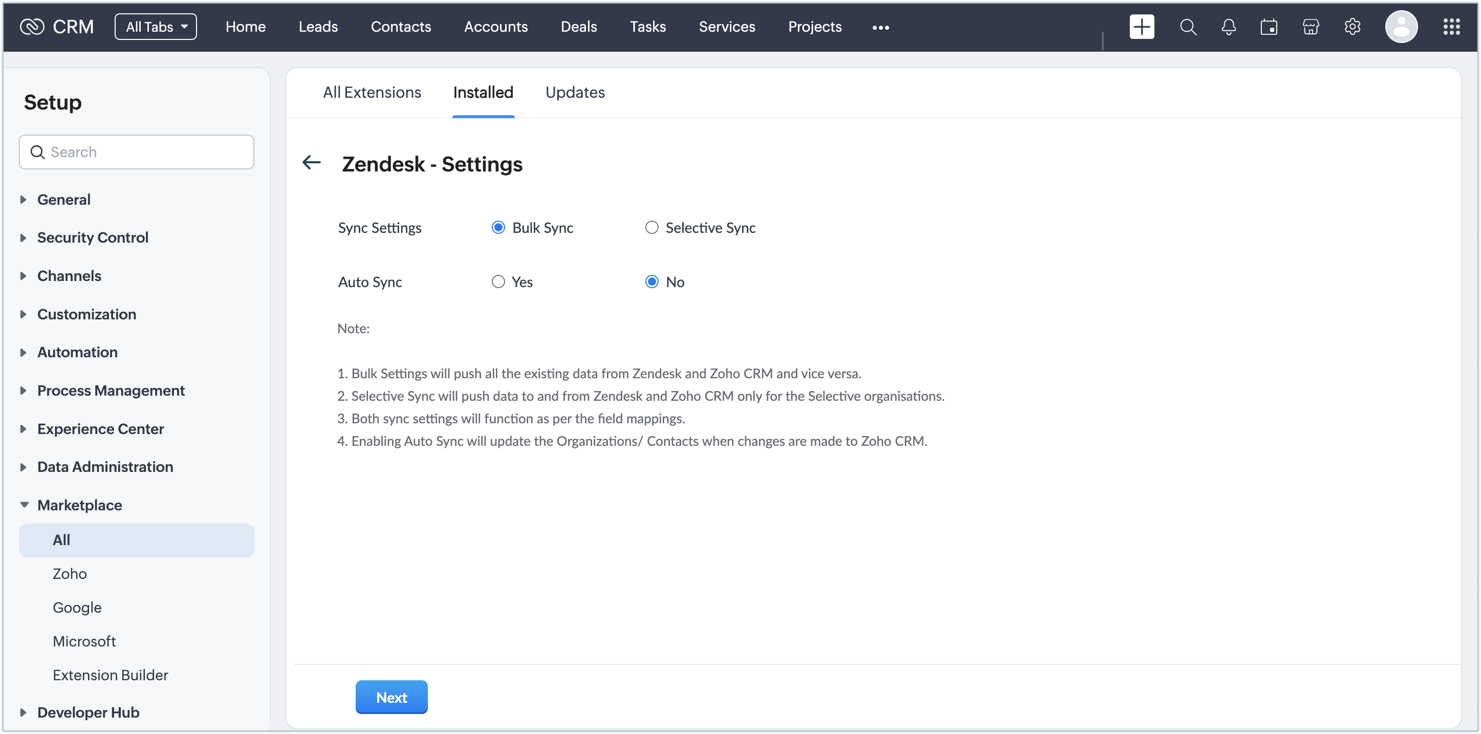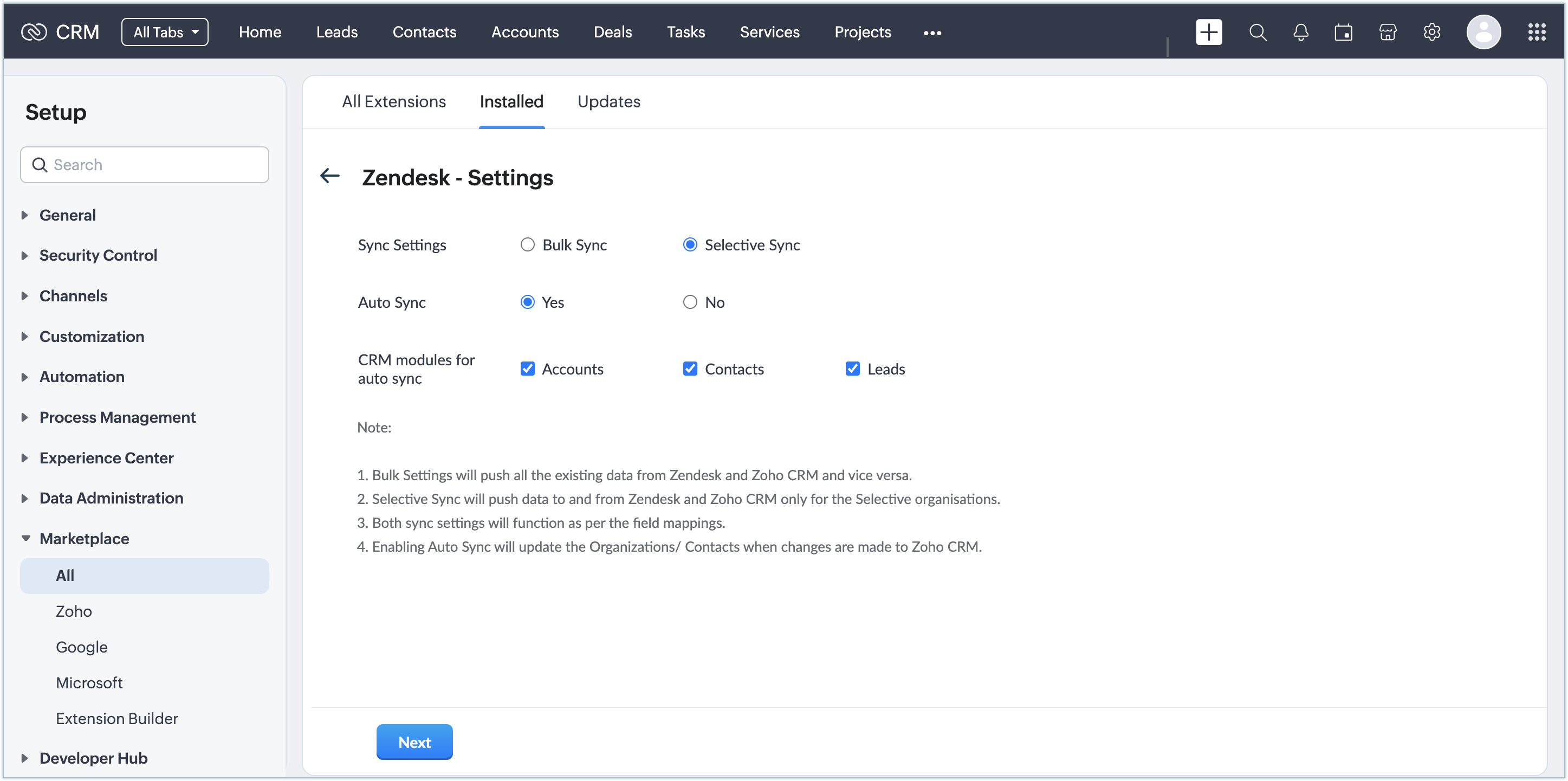 Once the extension is installed and authorized, you need to set up the data synchronization settings to import the contacts, leads, and accounts from Zendesk to CRM.