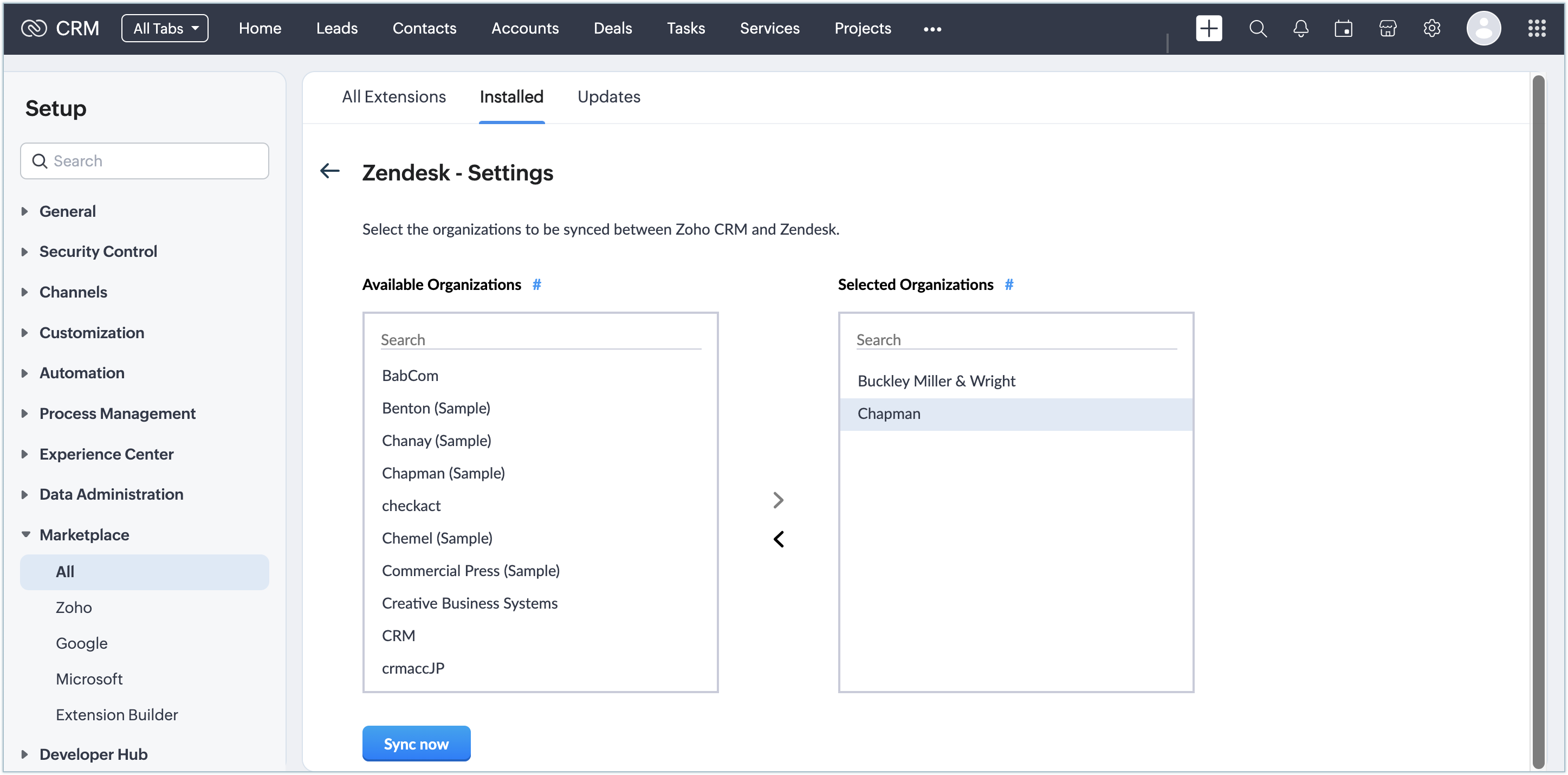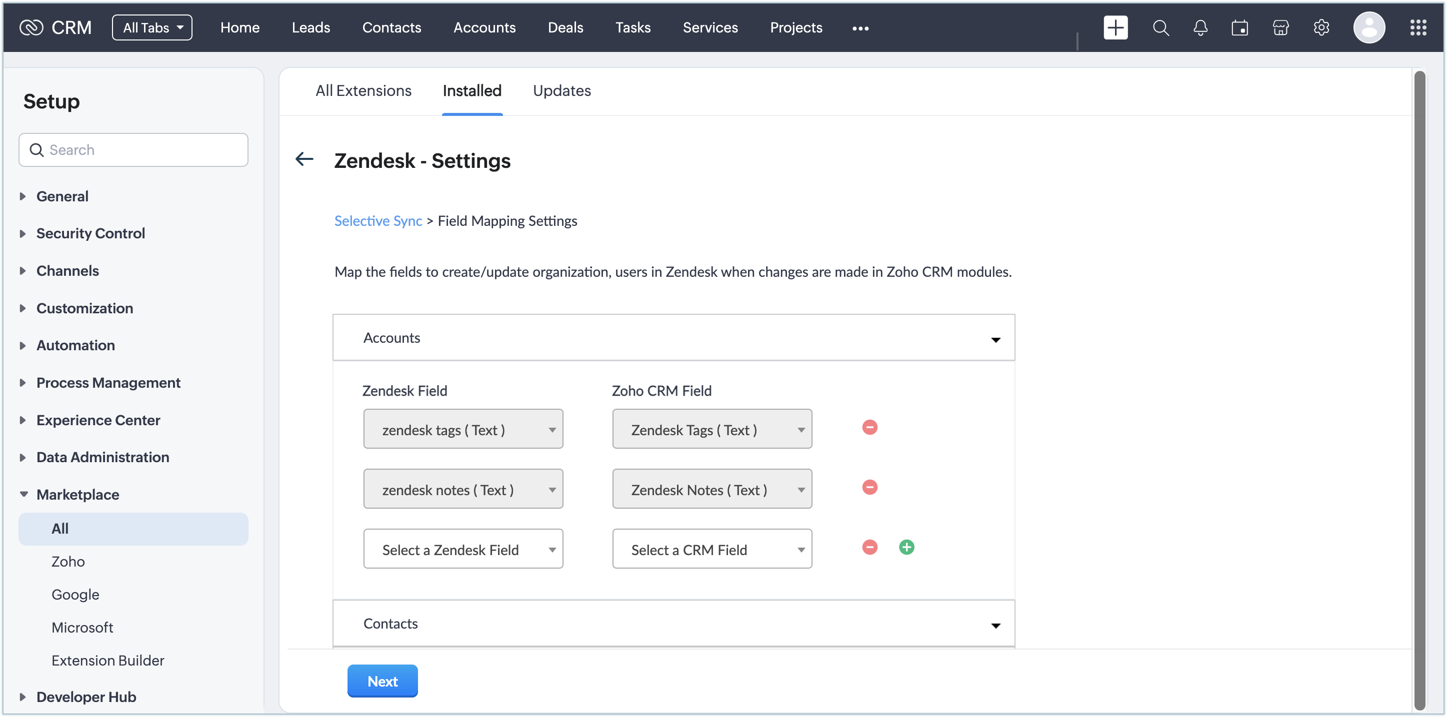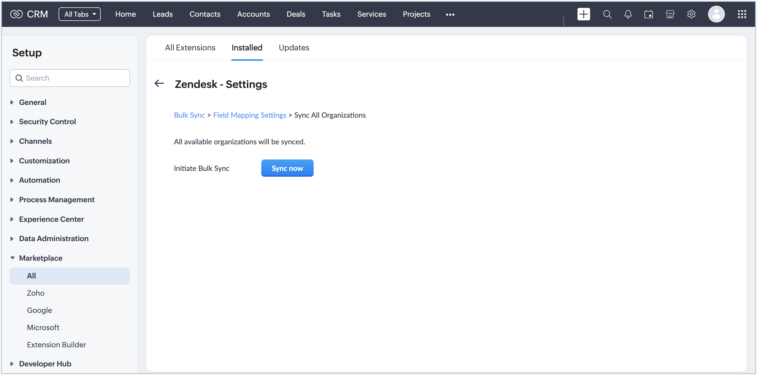 Once the extension is installed and authorized, you need to set up the data synchronization settings to import the contacts, leads, and accounts from Zendesk to CRM.