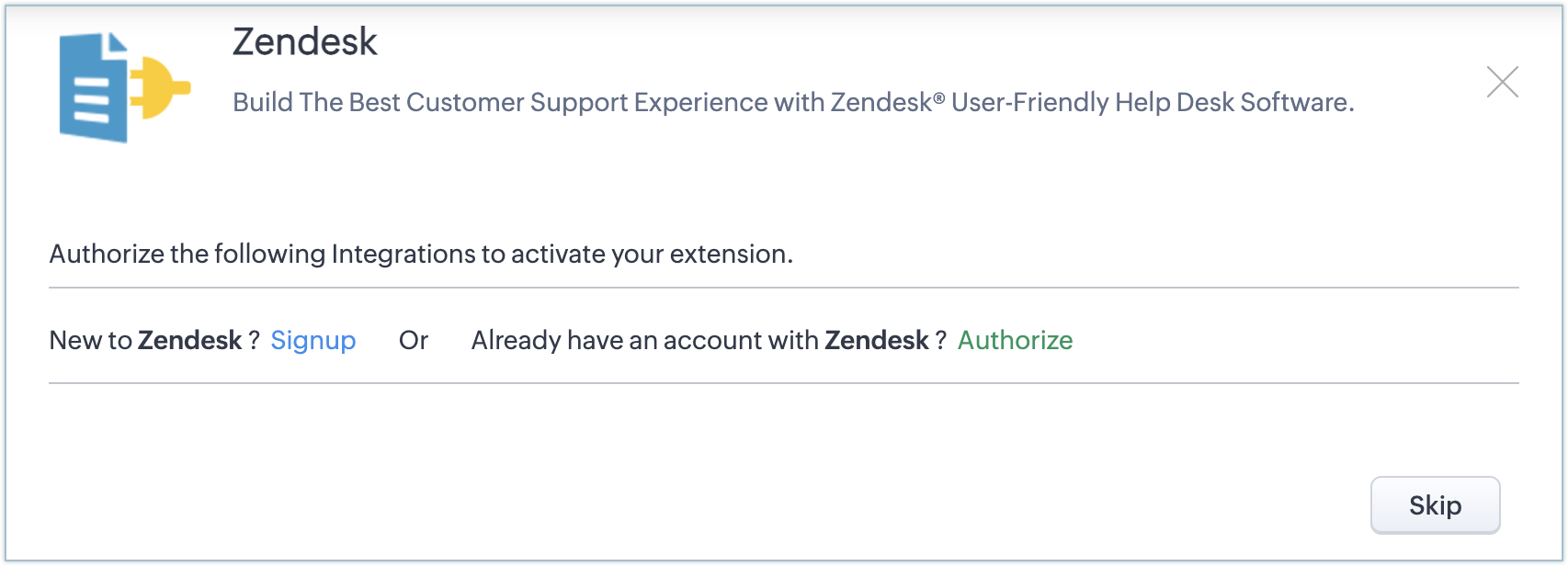 In the Zendesk extension details page, you can click Authorize.