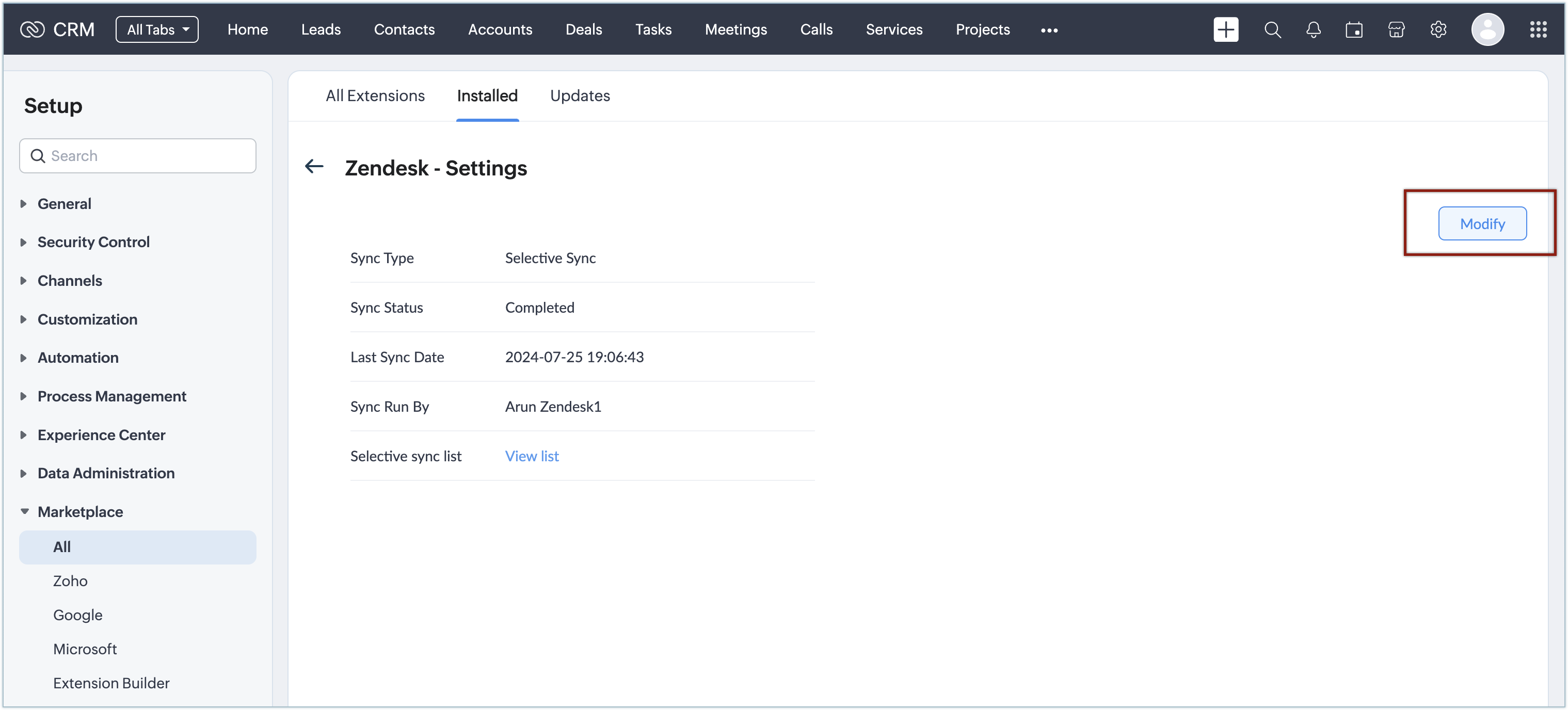 You can modify the extension synchronization settings any time using the modify button available in the Zendesk - Settings page. This button will be visible only after the initial synchronization is completed.