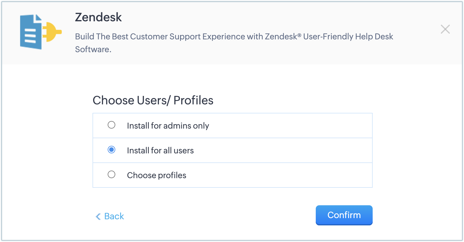 Install for all users: The extension will be installed in the CRM for all users. Users need to have an Zendesk account to use this feature.