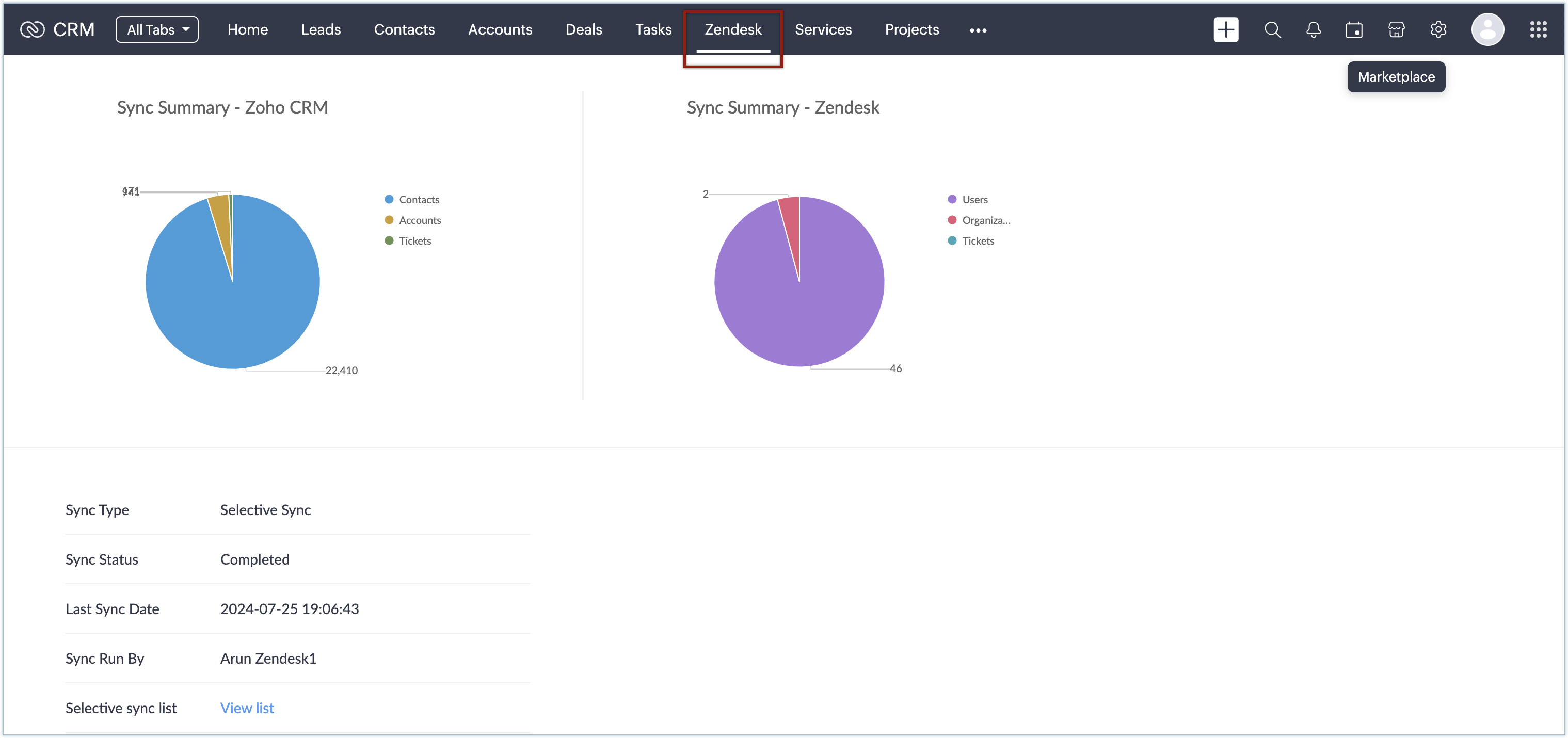 Once the synchronization is done, the statistical information about the synchronized information will be available as a dashboard in the Zendesk webtab. Any further information available from Zendesk after the initial sync will be synchronized in Zoho CRM in real time.