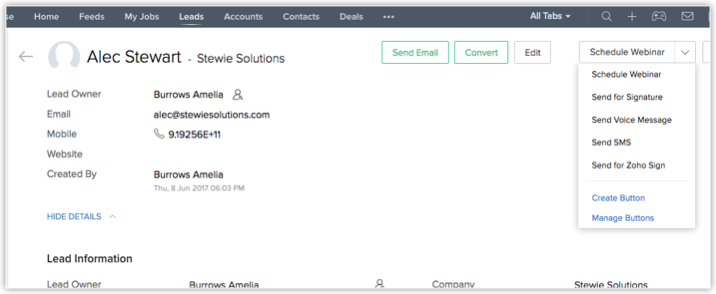Upon installation, the details page for leads, contacts, accounts, and deals will have a button named Send for Zoho Sign. This button can be used to send documents that need to be signed by contacts. To send your documents for digital signing:
