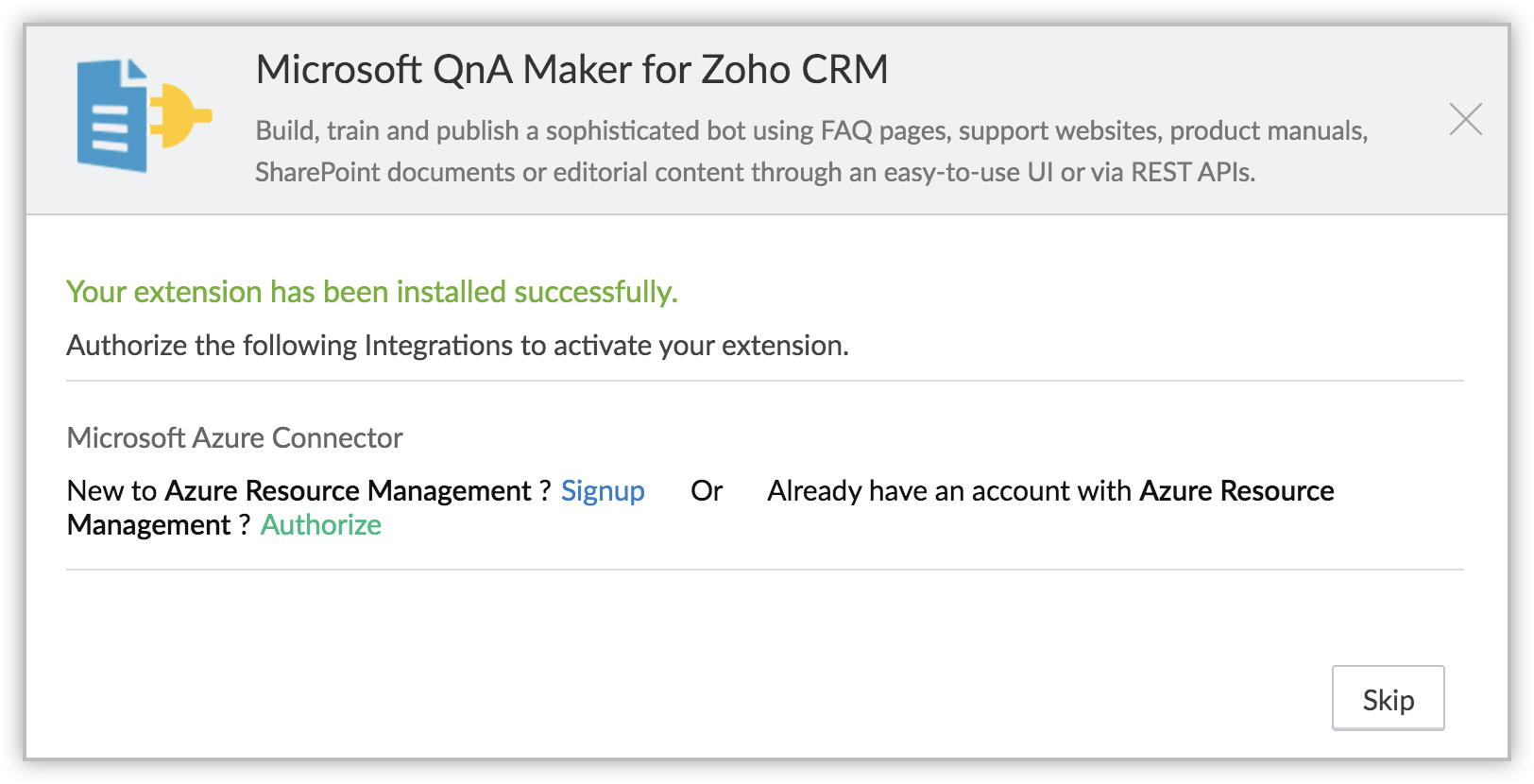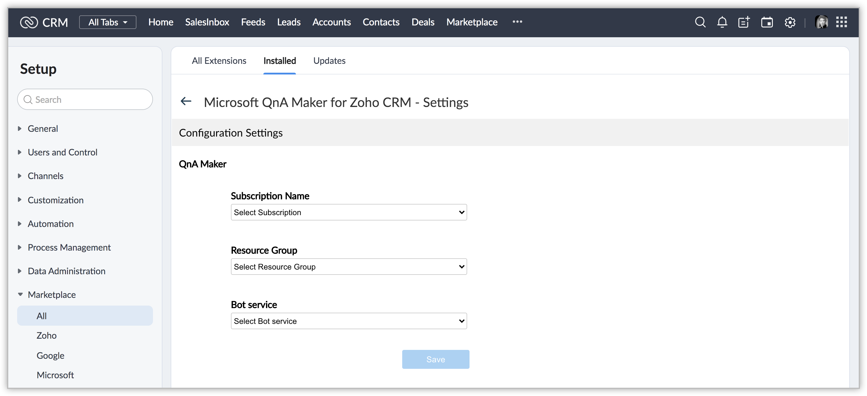 1. If you skip this step, you can authorize it later from your Setup page in Zoho CRM. To do so, go to Setup > Marketplace > All. Find the Microsoft QnA Maker extension and click Configure.