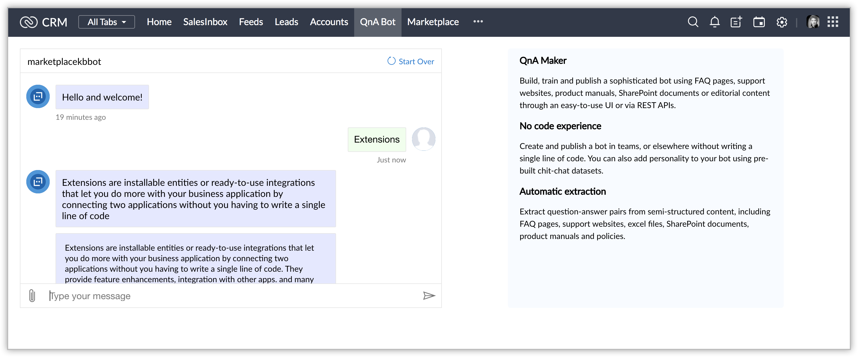 The Microsoft QnA Maker extension for Zoho CRM lets you access AI bots in Zoho CRM that can answer your queries. Any bots created in your Microsoft cognitive services can be linked with Zoho CRM with an API call.