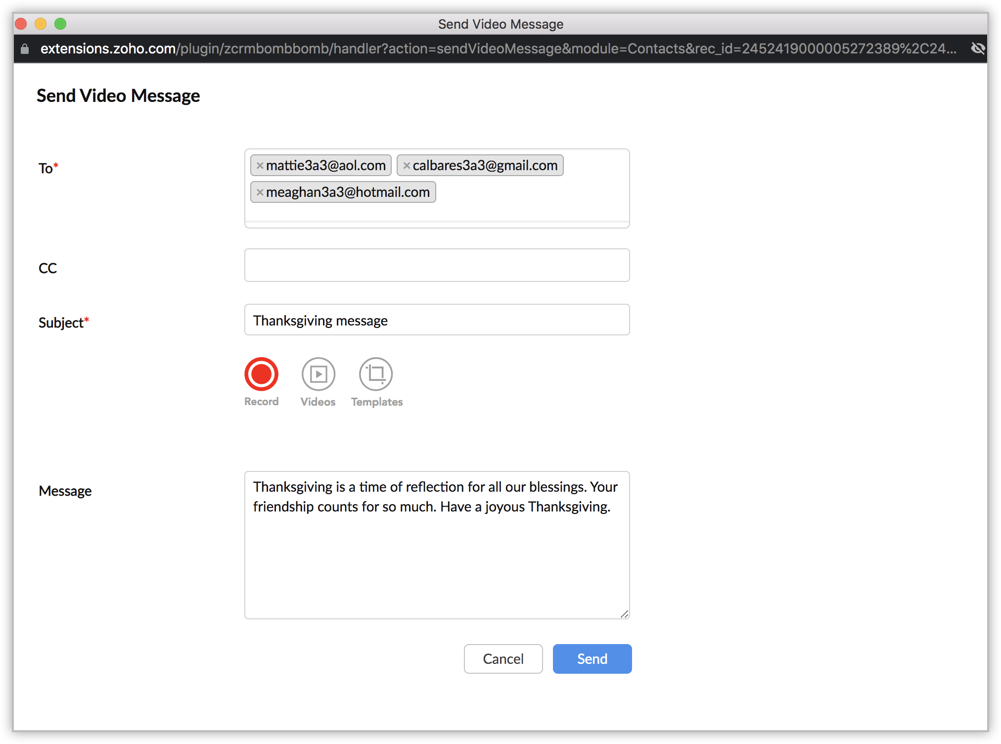 The selected video messages will be sent to the recipients, and the details will be added as a record to the BombBomb History module.