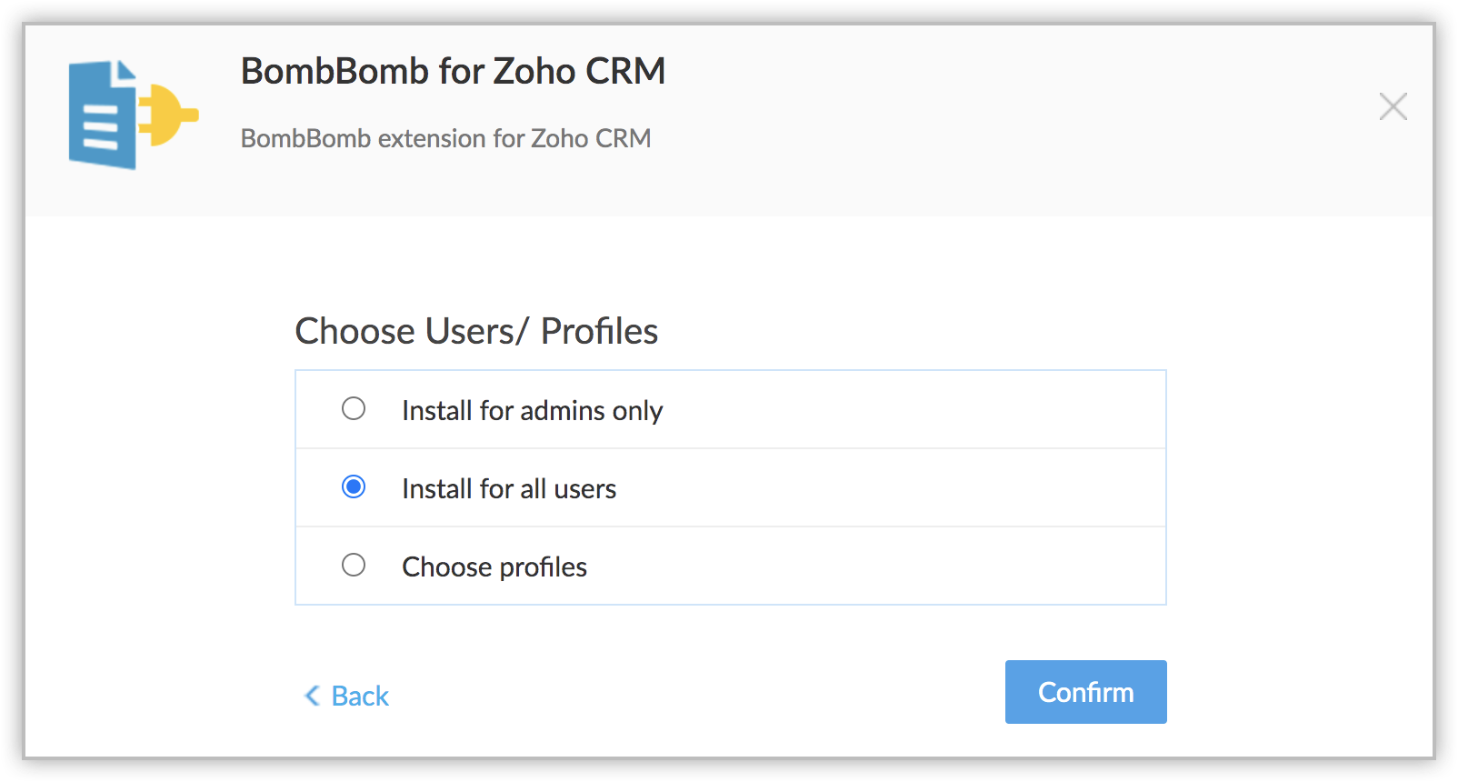3. Choose profiles - The extension will be installed in CRM only for the selected users. Choose this option, click Continue , then select the profiles.