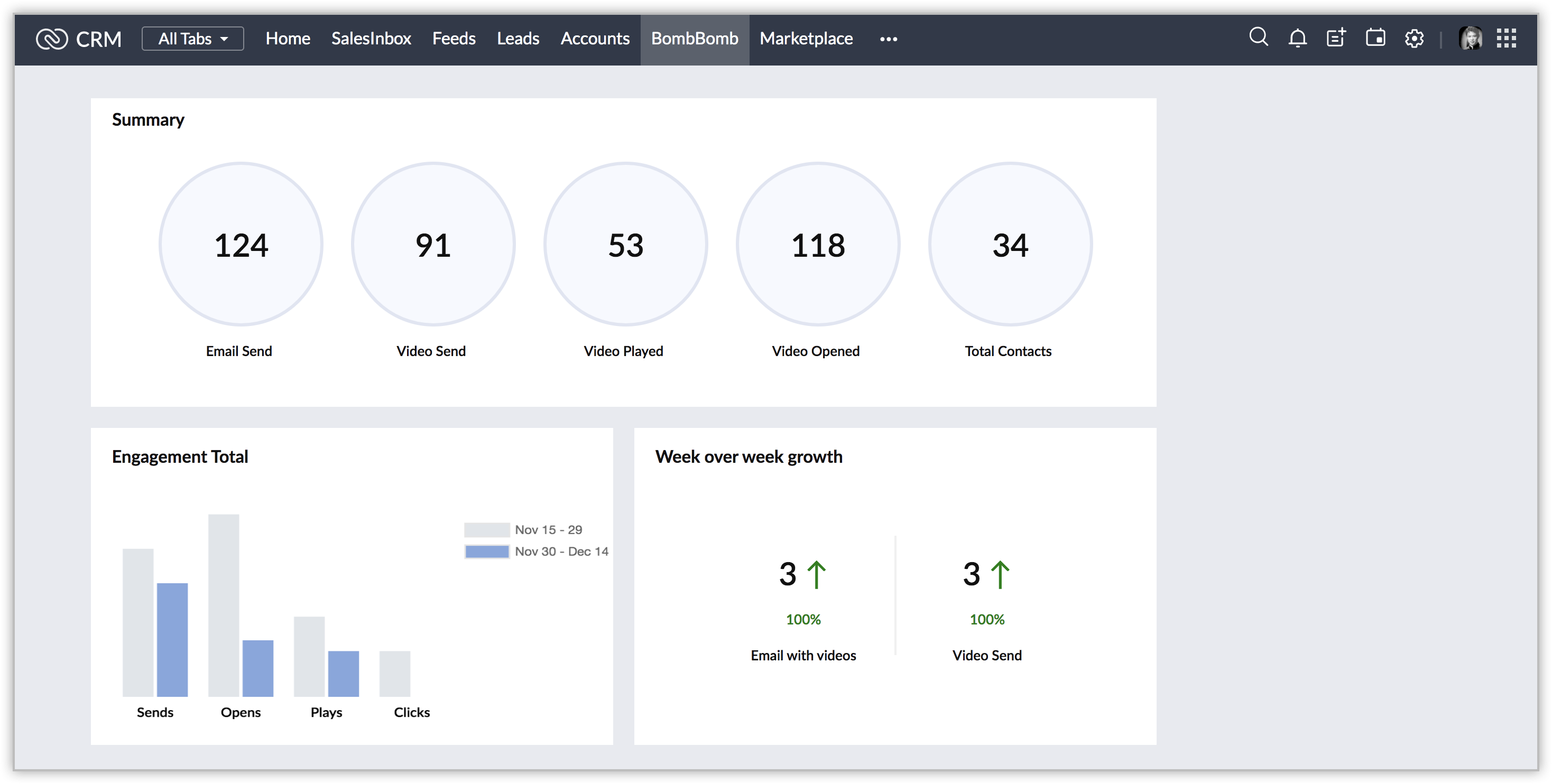 The details about the configured team will be fetched from the BombBomb and shown in the BombBomb webtab, under three sections: Summary, Engagement Total, and Week over week growth. By default, only the data for the last 2 years will be shown in the summary.