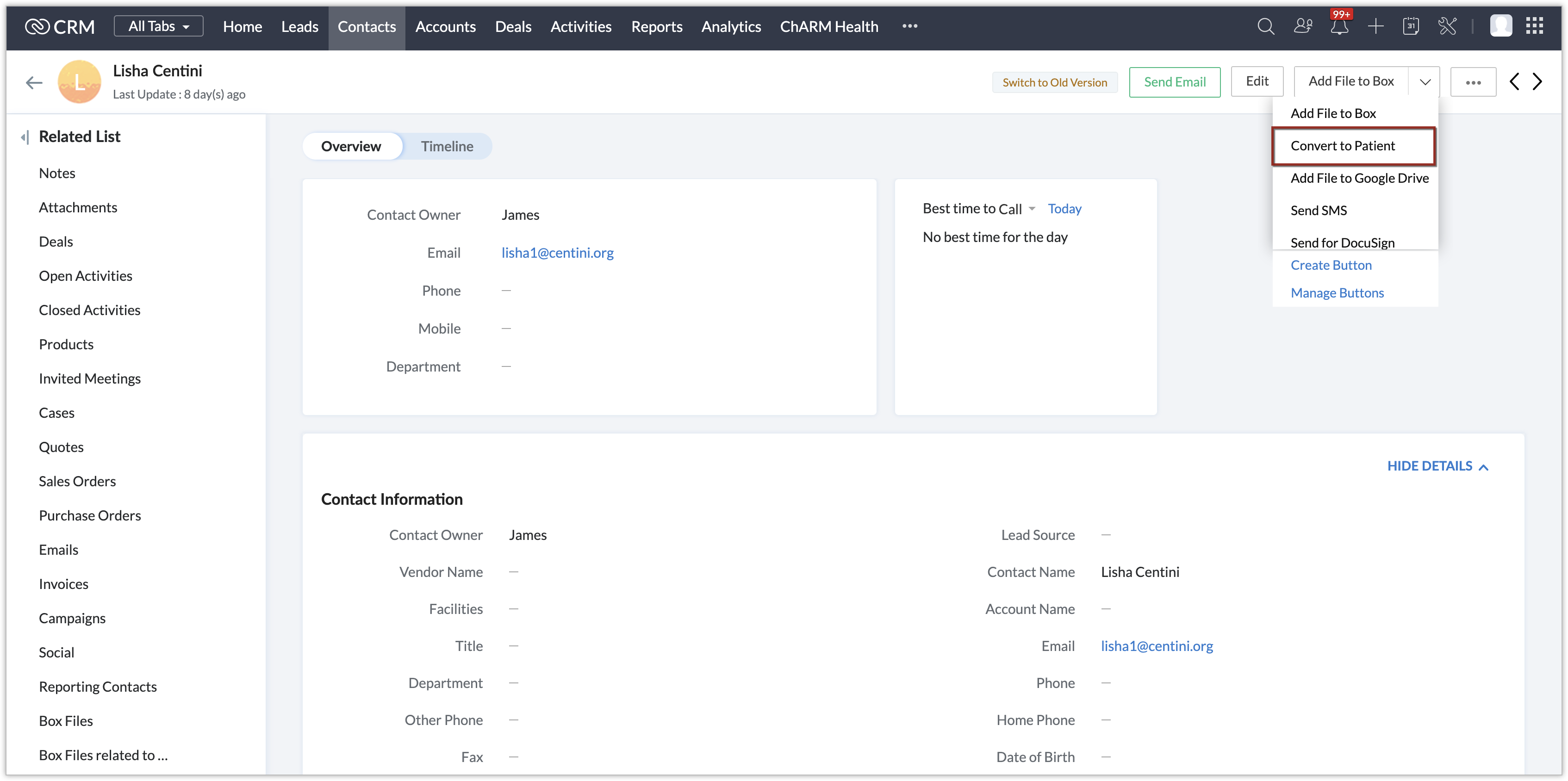 You can add a new patient record to ChARM Health from within the Zoho CRM. This can be done by converting the existing contacts in Zoho CRM to patients in ChARM Health.