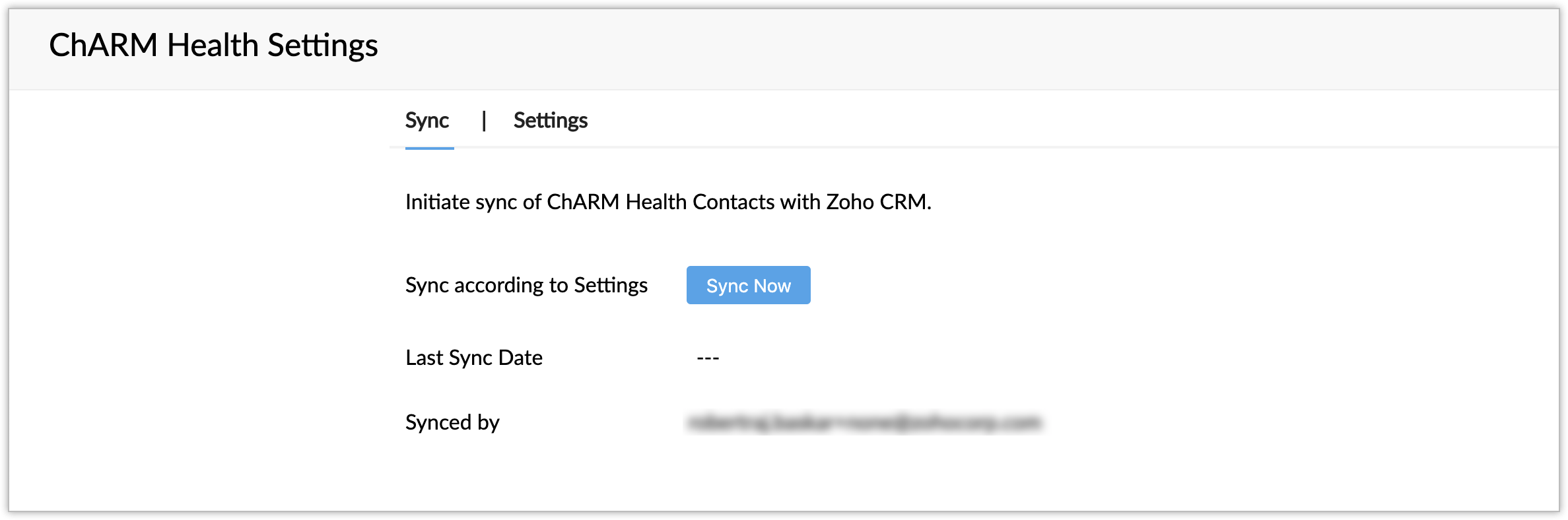 Once the extension is installed, a web tab called ChARM Health will be added in your CRM account. Using this web tab, you can customize your sync settings any time in Zoho CRM to synchronize your contacts between ChARM Health from Zoho CRM.