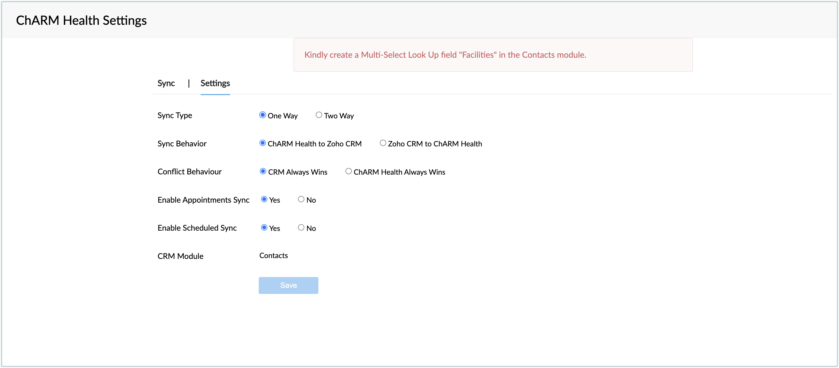 - In Sync Behaviour, select ChARM Health to Zoho CRM or Zoho CRM to ChARM Health (only for One Way sync).