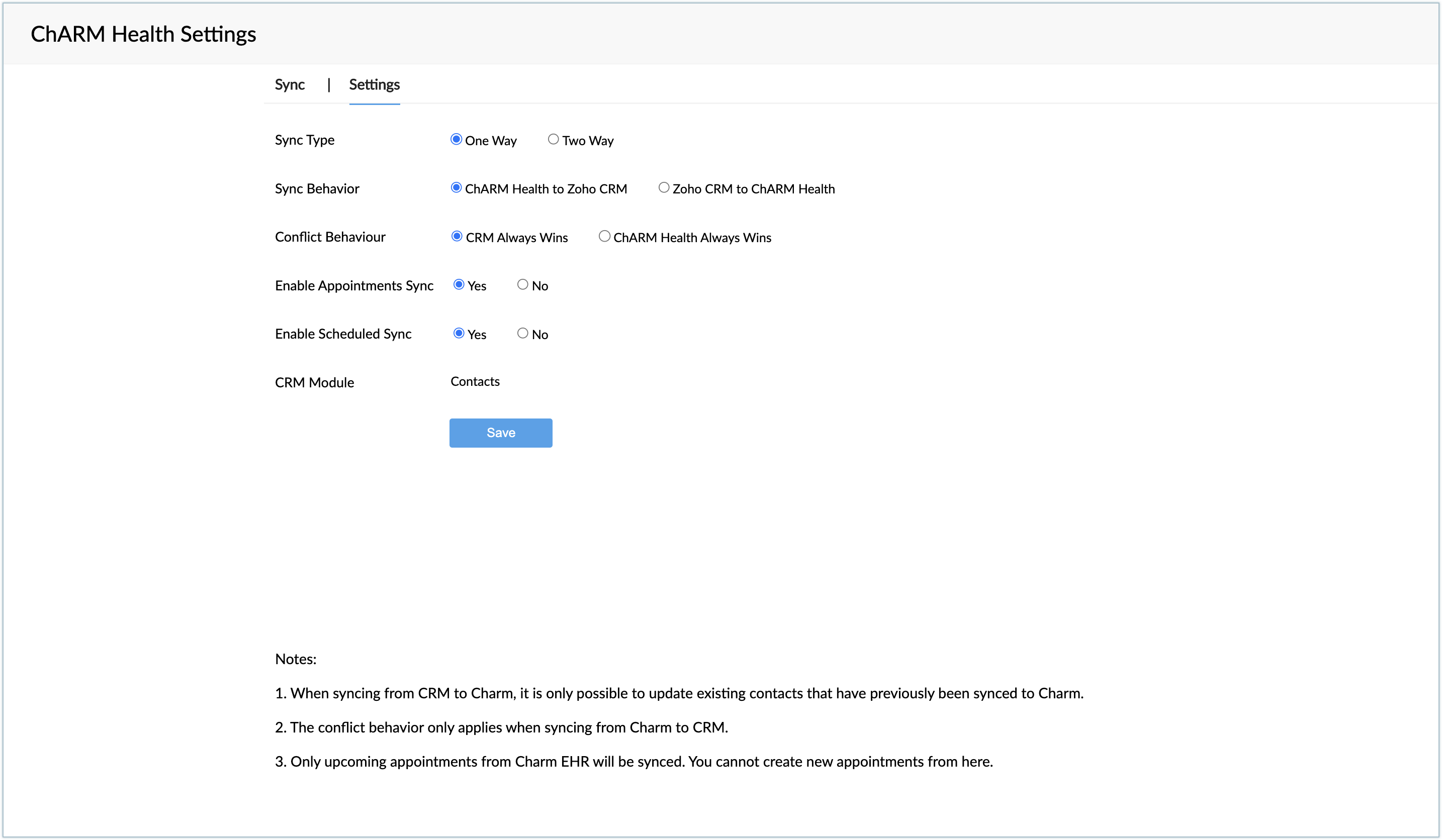 - In Enable Appointments Sync, you can choose to sync all the upcoming appointments in ChARM Health to Zoho CRM.