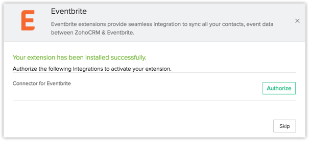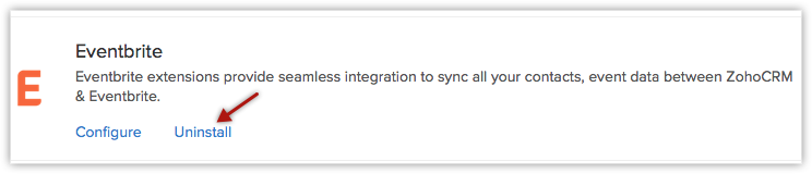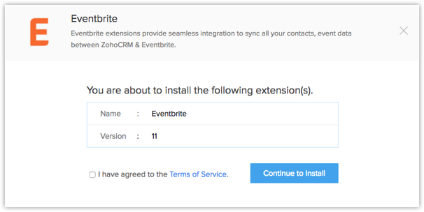 Zoho Marketplace and install the Eventbrite extension or log in to your Zoho CRM account and install.