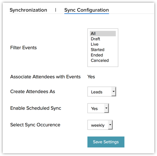 - Select the type of events that you want to synchronize. For example, Draft, Live, Started, etc.