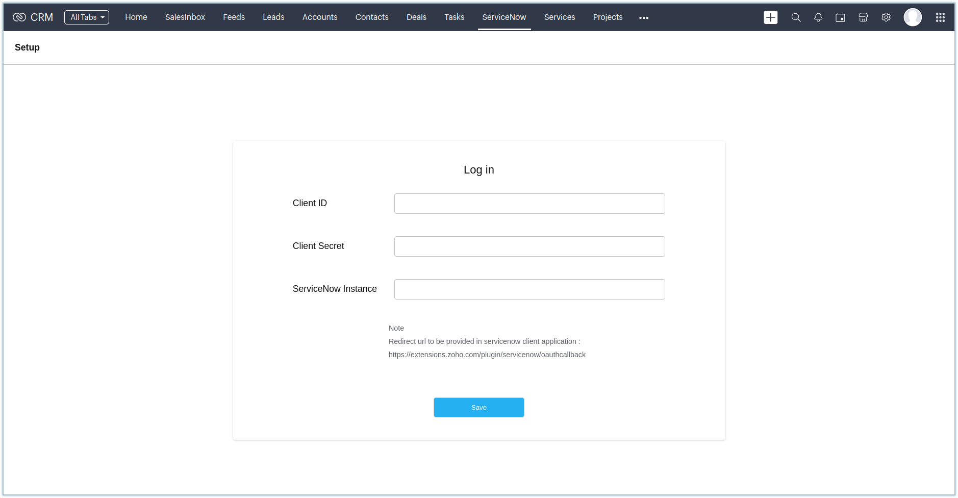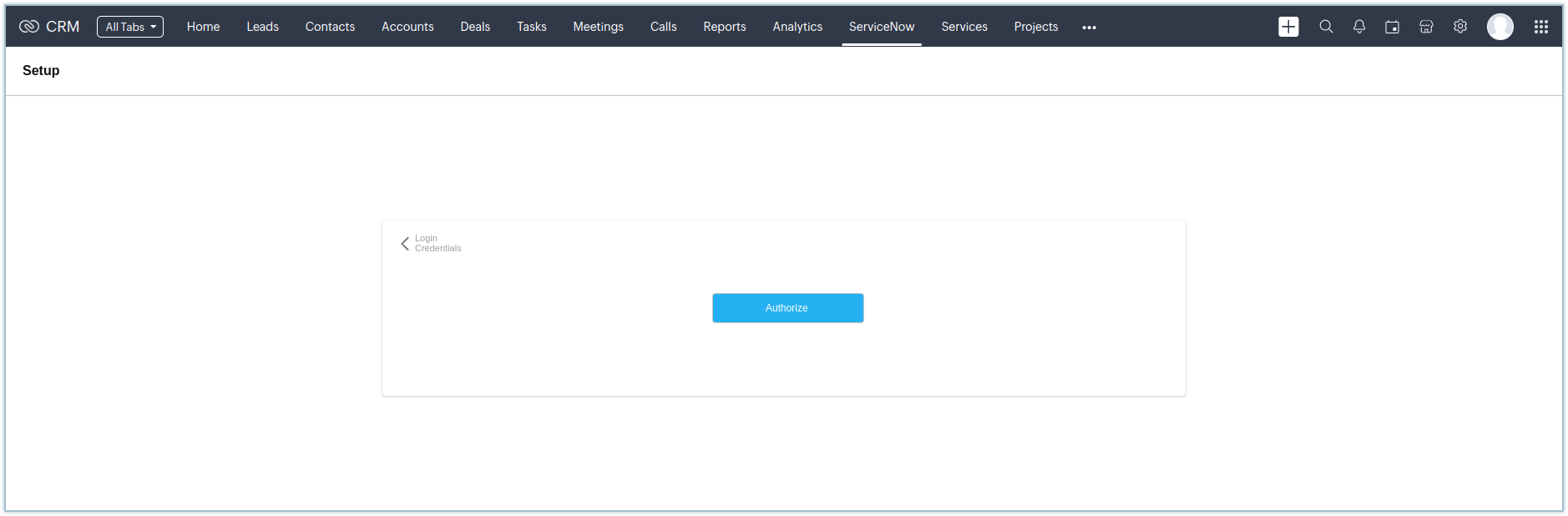 Once the extension is installed, the ServiceNow web tab will be created in your Zoho CRM account. You'll need to authorize the extension in this web tab.