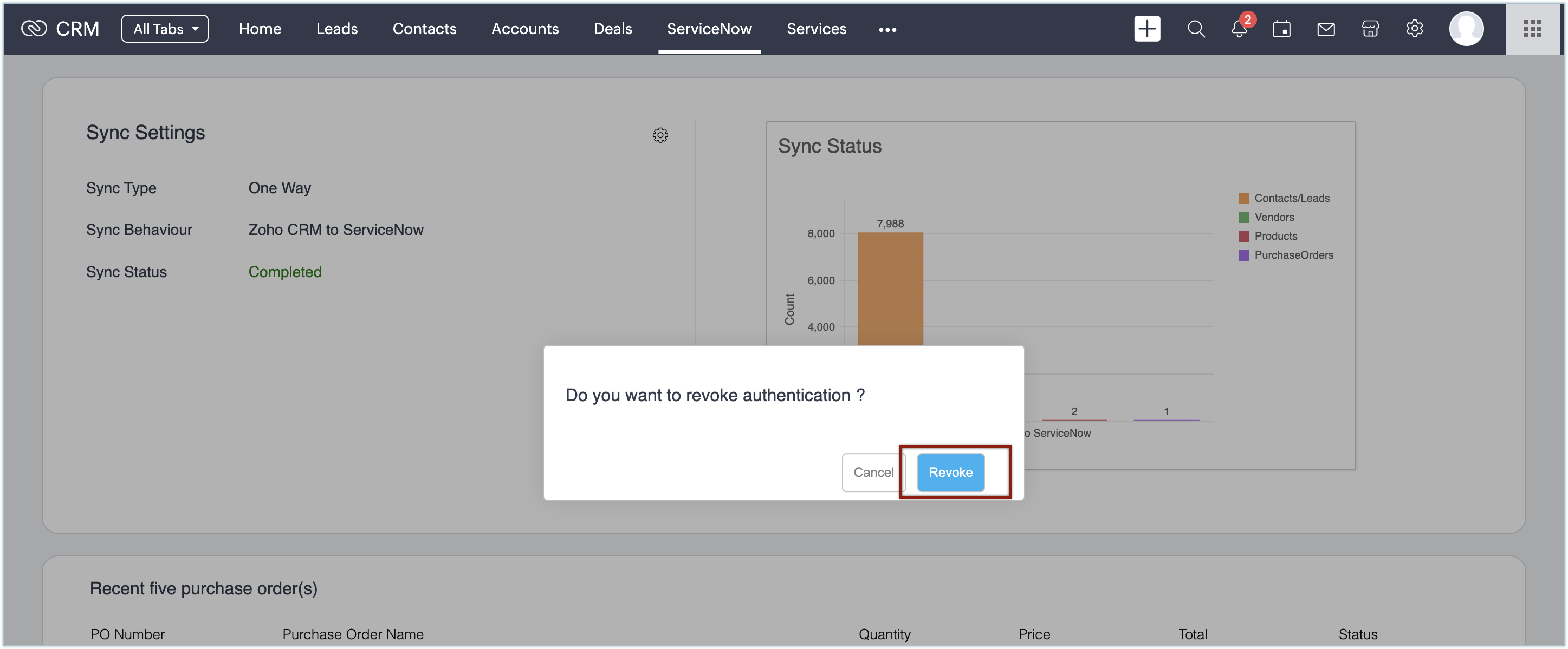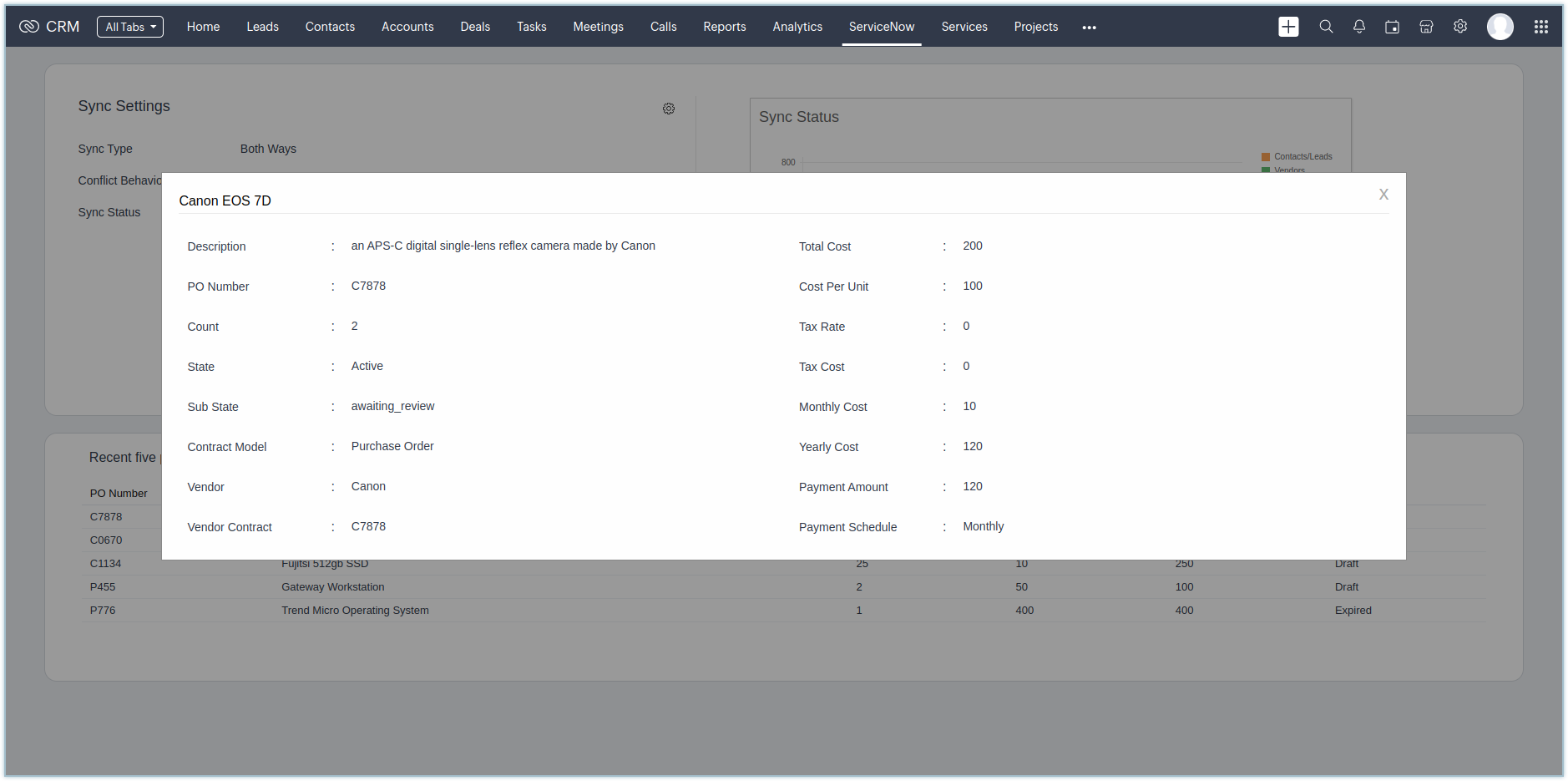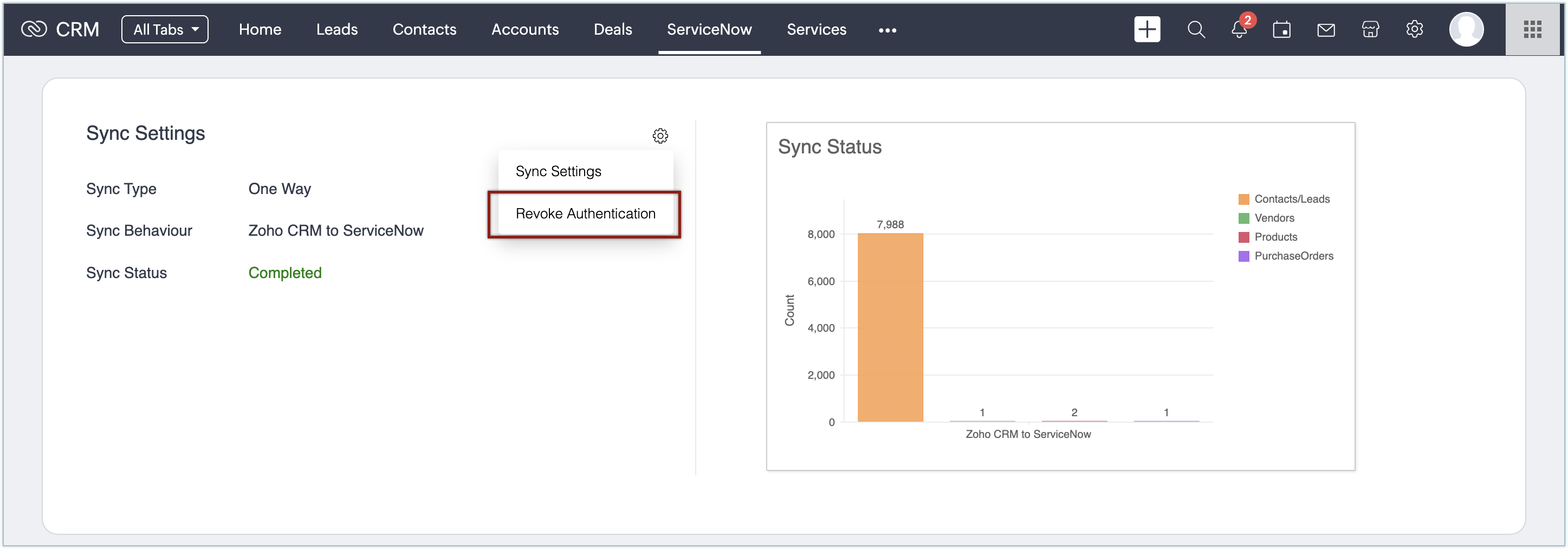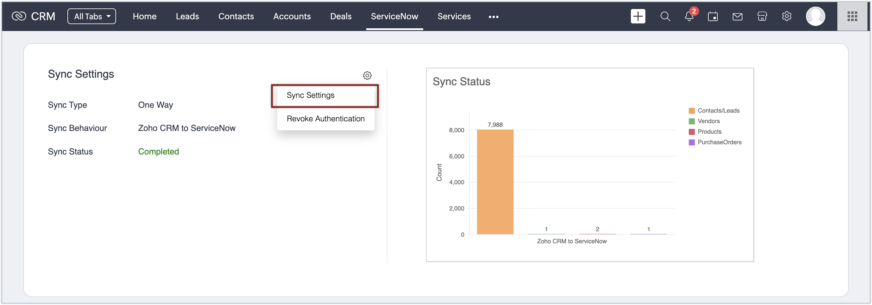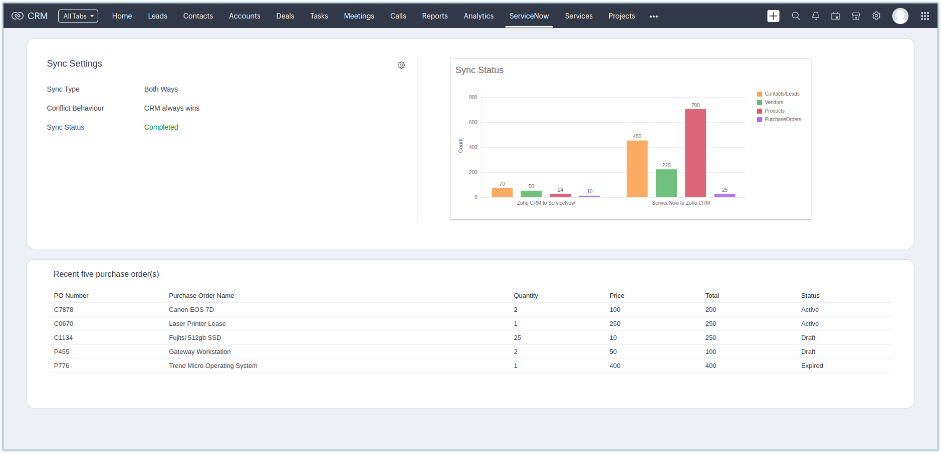 With the ServiceNow extension for Zoho CRM, you can sync the contacts, vendors, purchase orders, products, and cases with Zoho CRM, and get them mapped within the Contacts or Leads modules. The extension supports bidirectional synchronization, which occurs in real time.