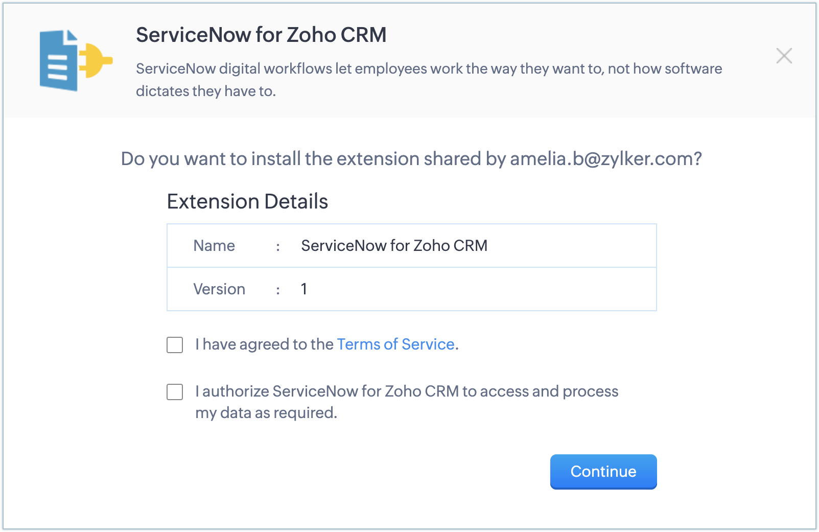 You can install the ServiceNow extension from Zoho Marketplace, or install it from within your Zoho CRM account using following steps: