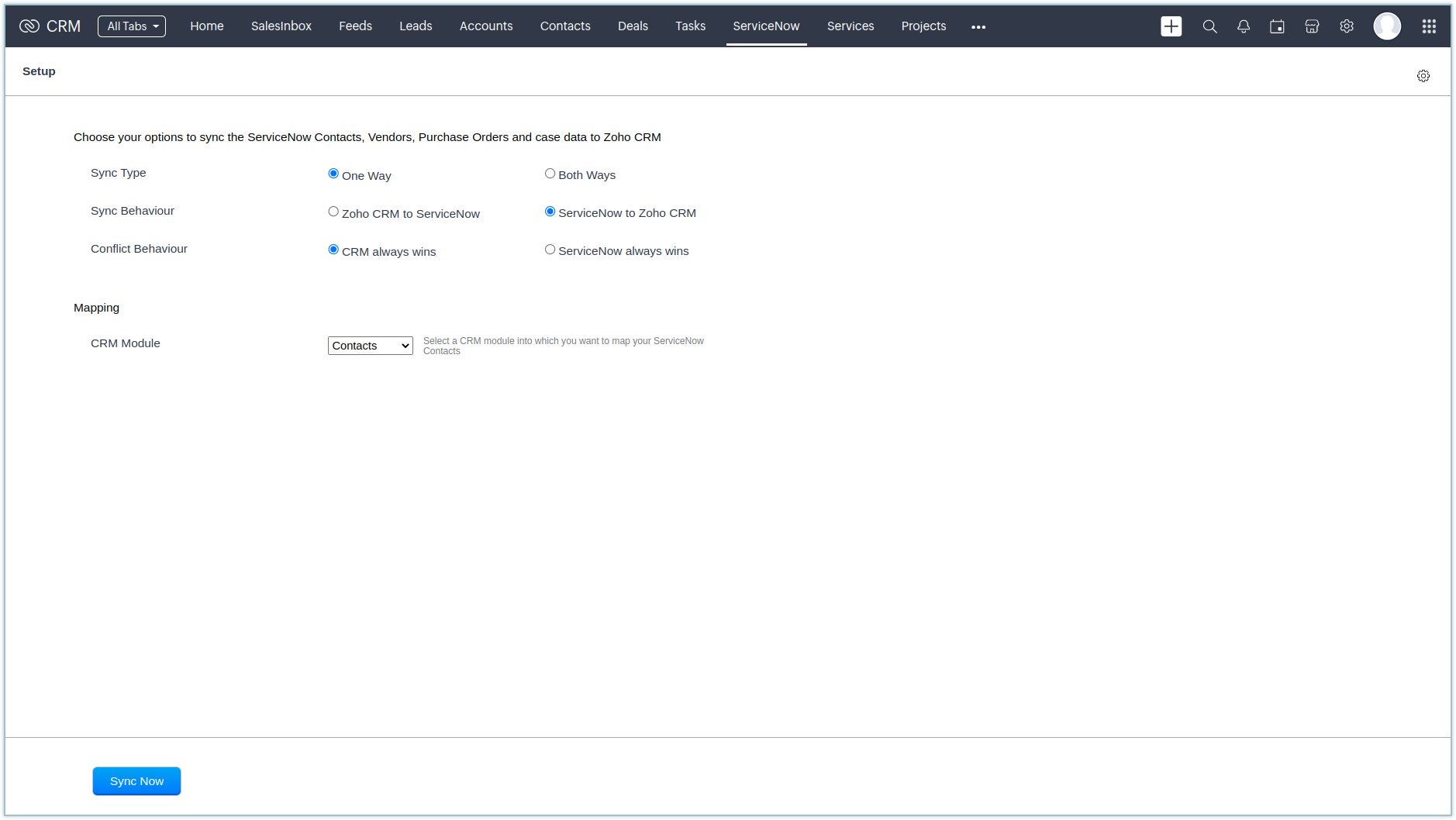 Select ServiceNow to Zoho CRM or Zoho CRM to ServiceNow next to Sync Behavior.