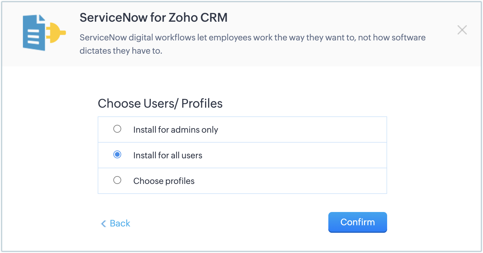 Choose profiles: The extension will be installed in CRM for the users you select. If you choose this option, click Confirm, then select the desired profiles.