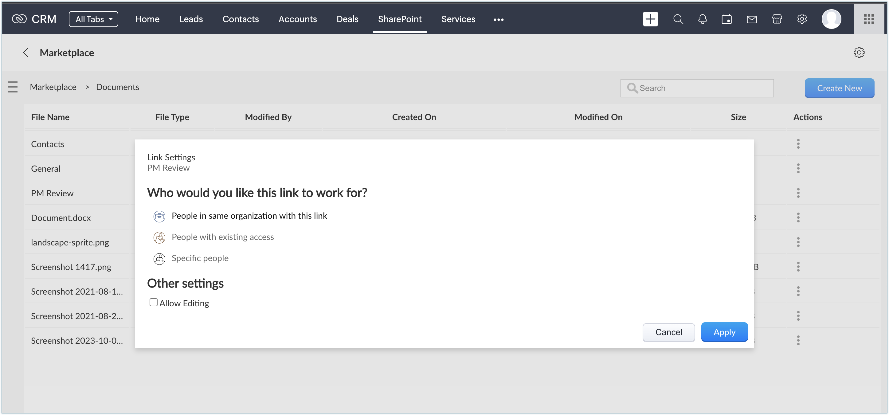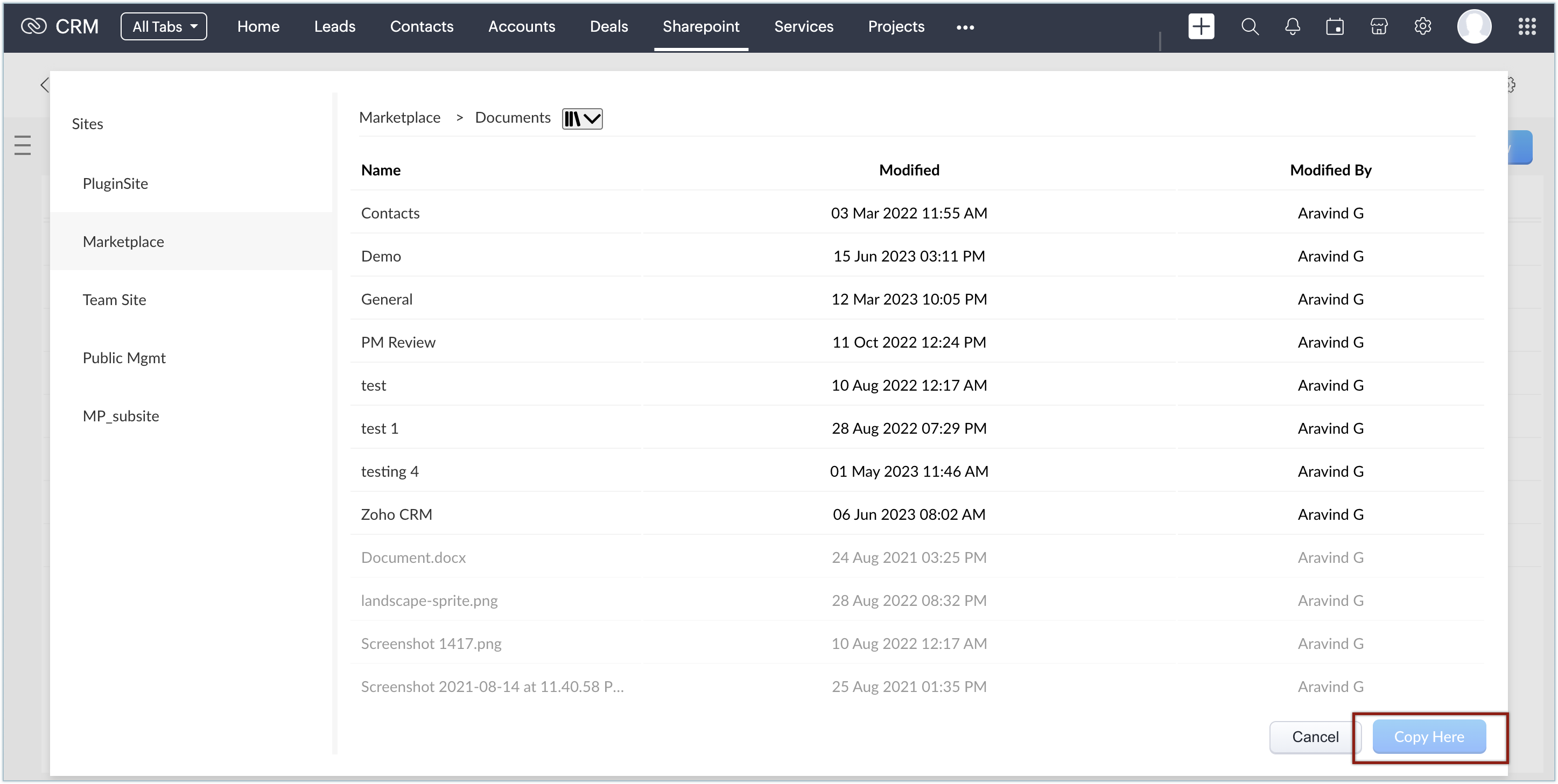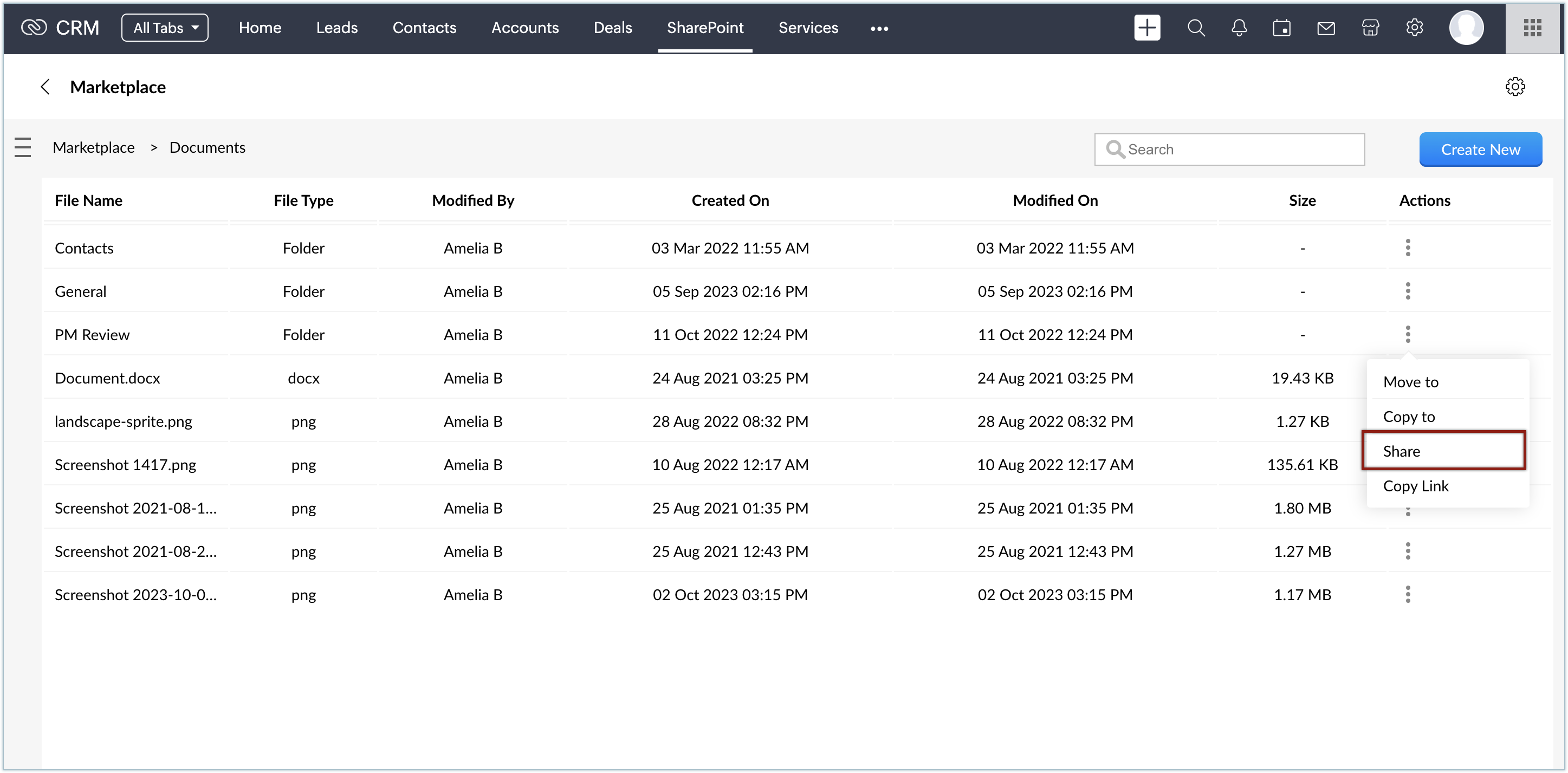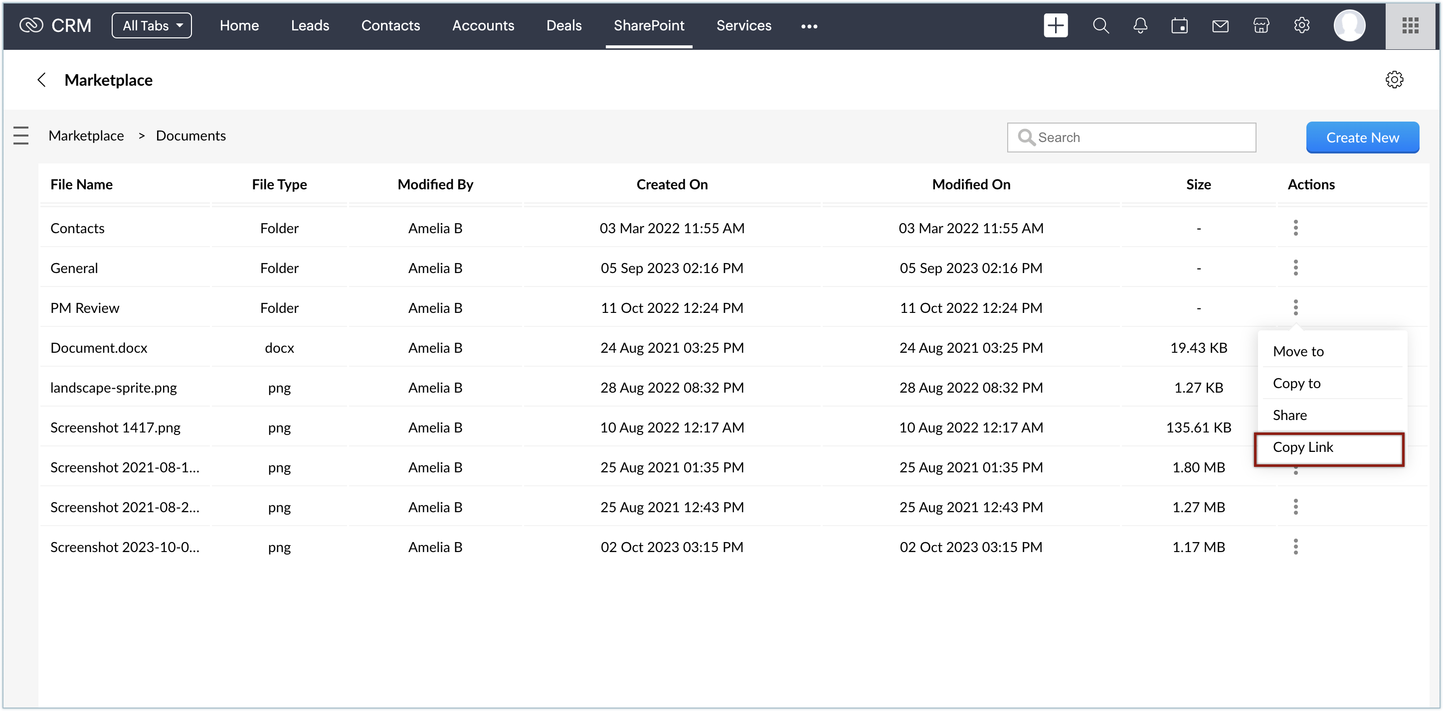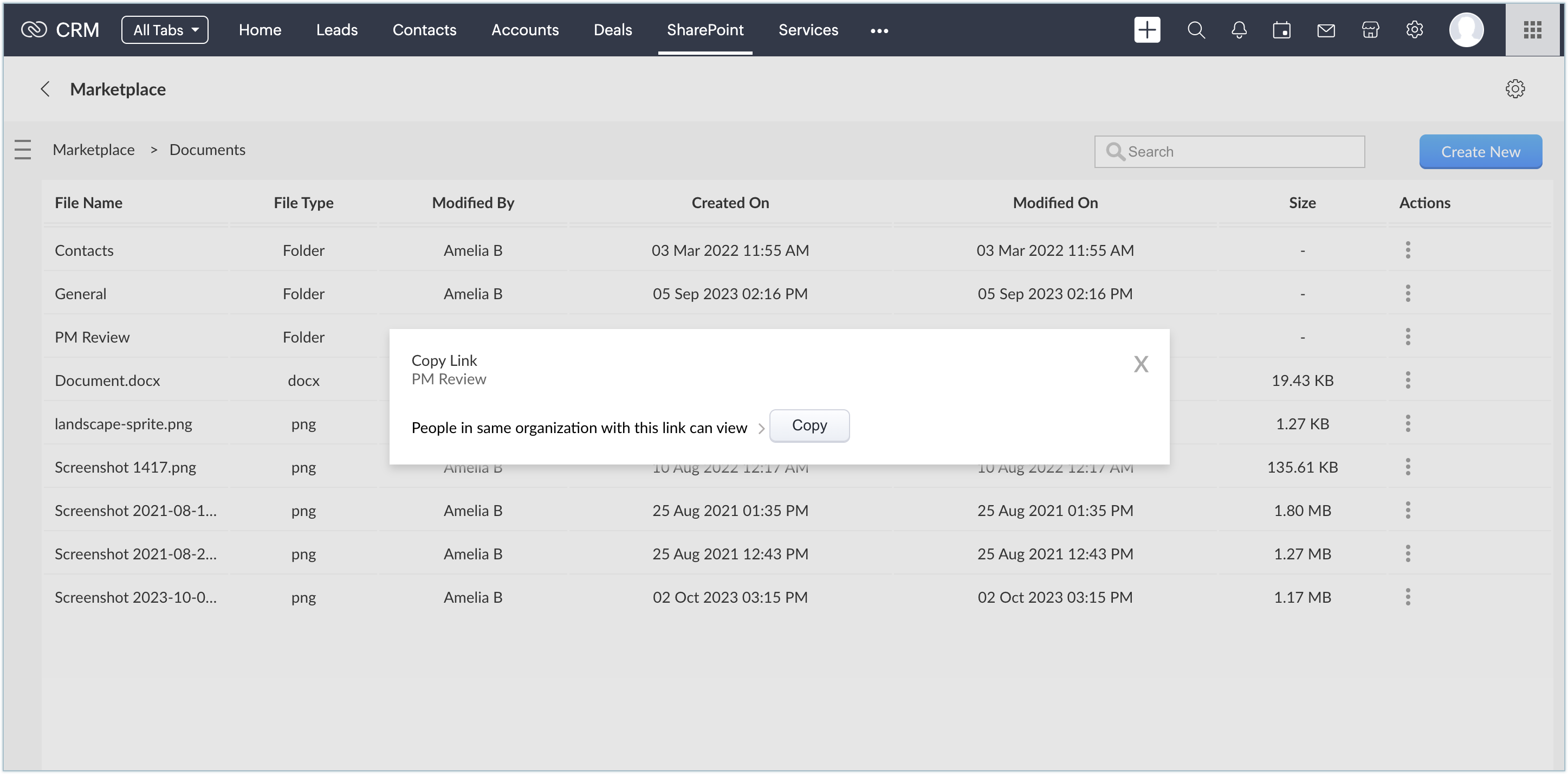 You can also share files or folders using the copy link option, which works similarly to the share option; however, instead of adding leads or contacts, a link will be generated, which you can copy and share with users.