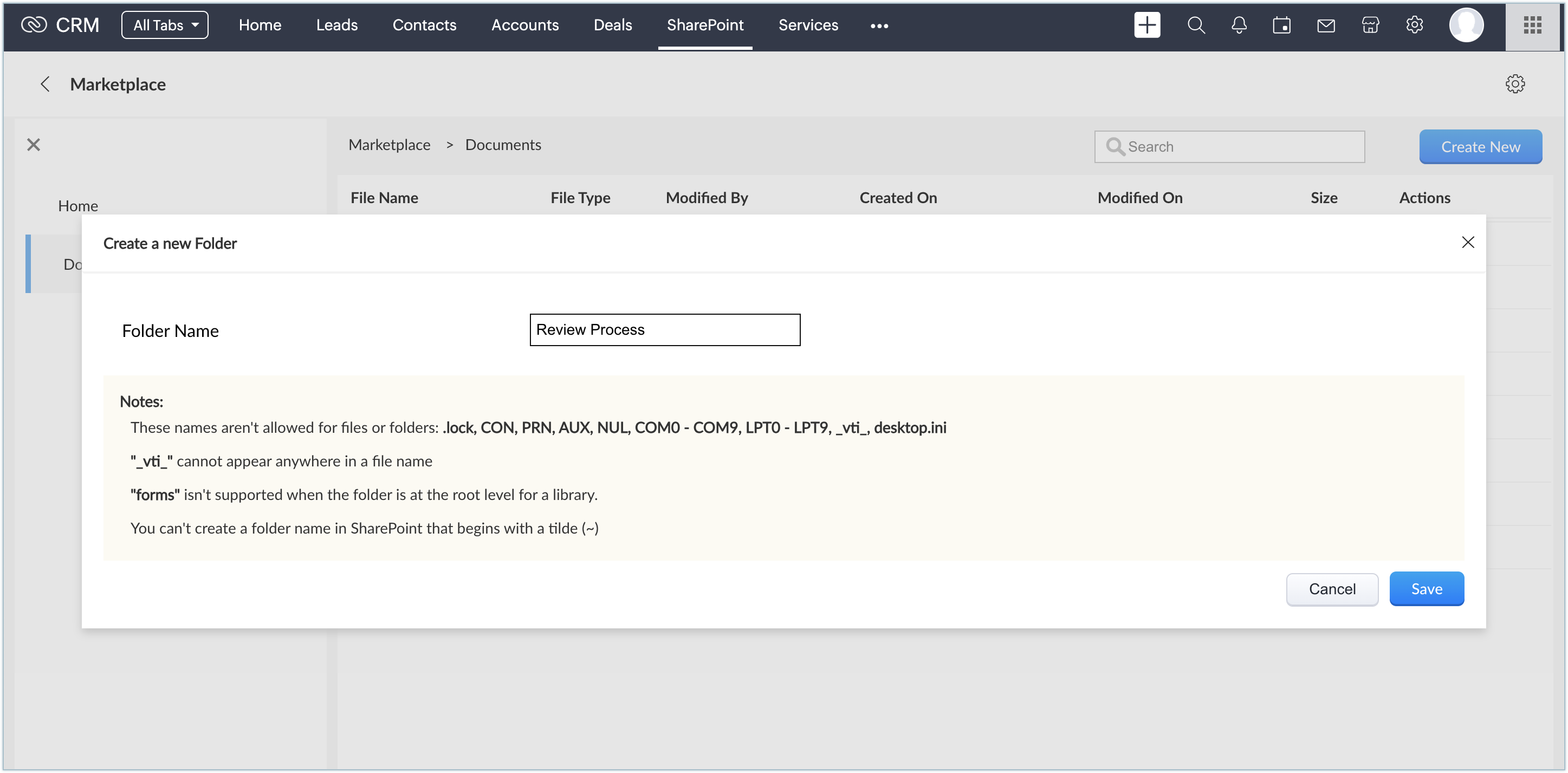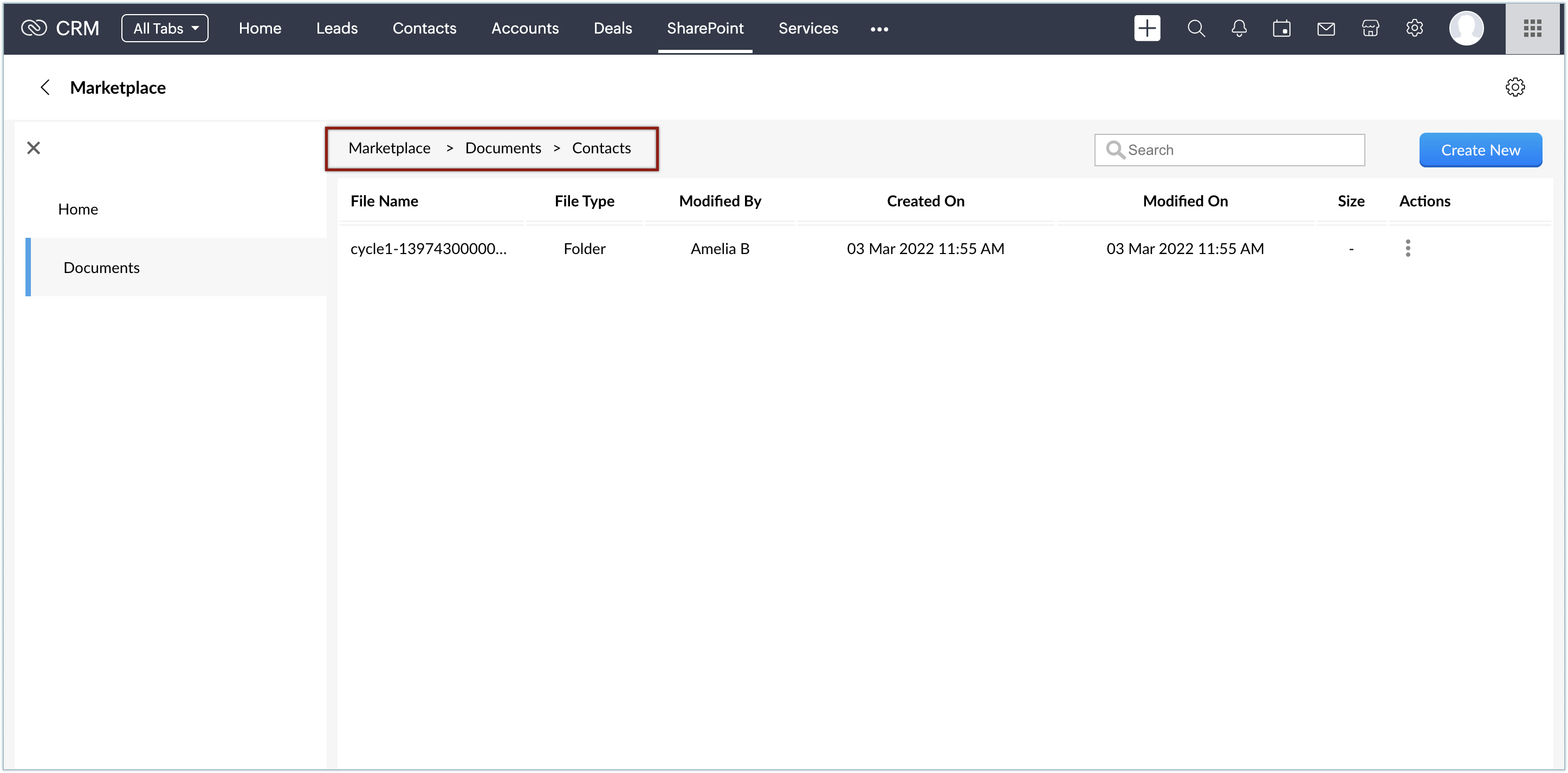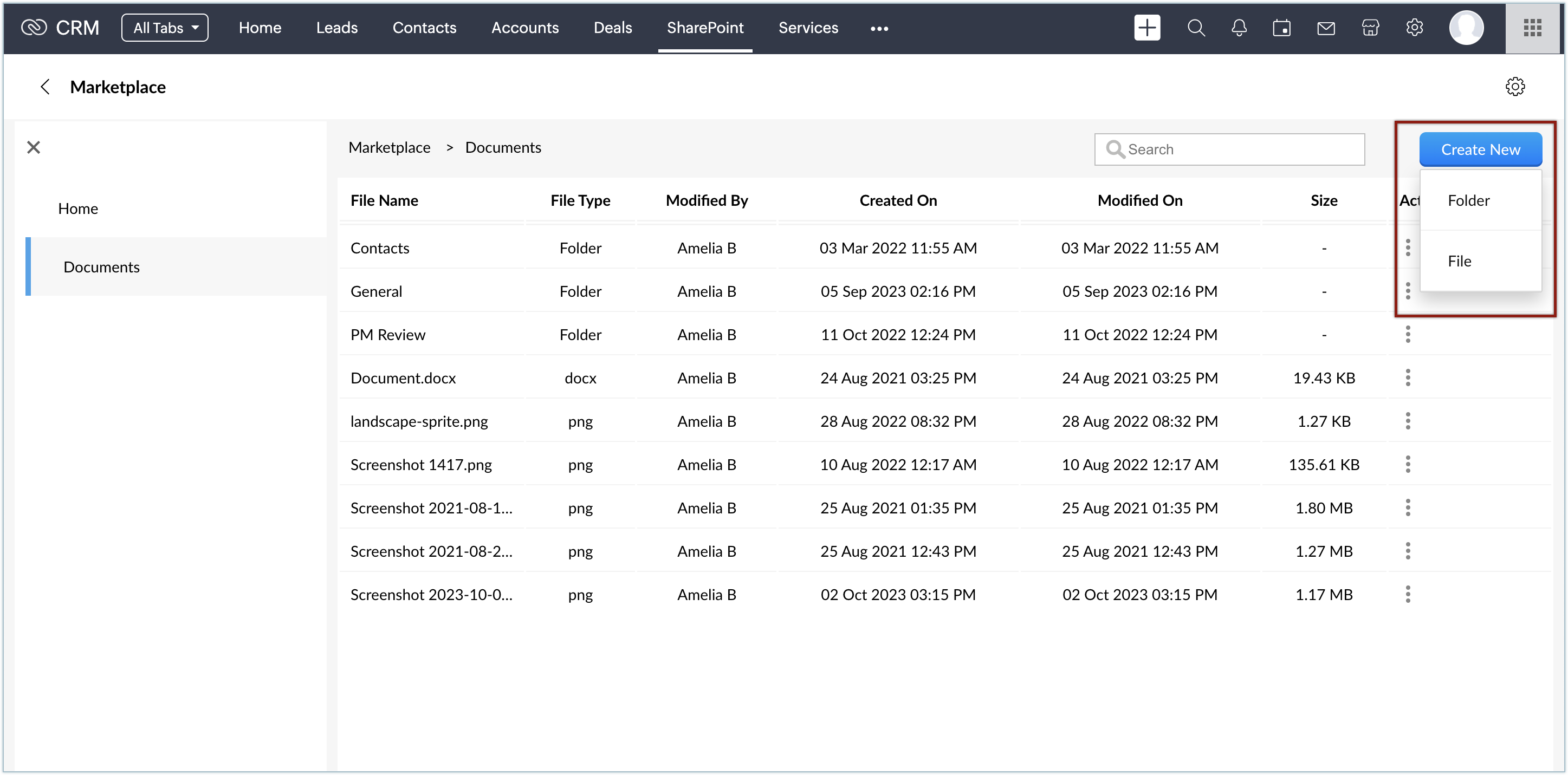 While the data sync brings in SharePoint data to Zoho CRM, you can also create files and folders in SharePoint from within Zoho CRM.