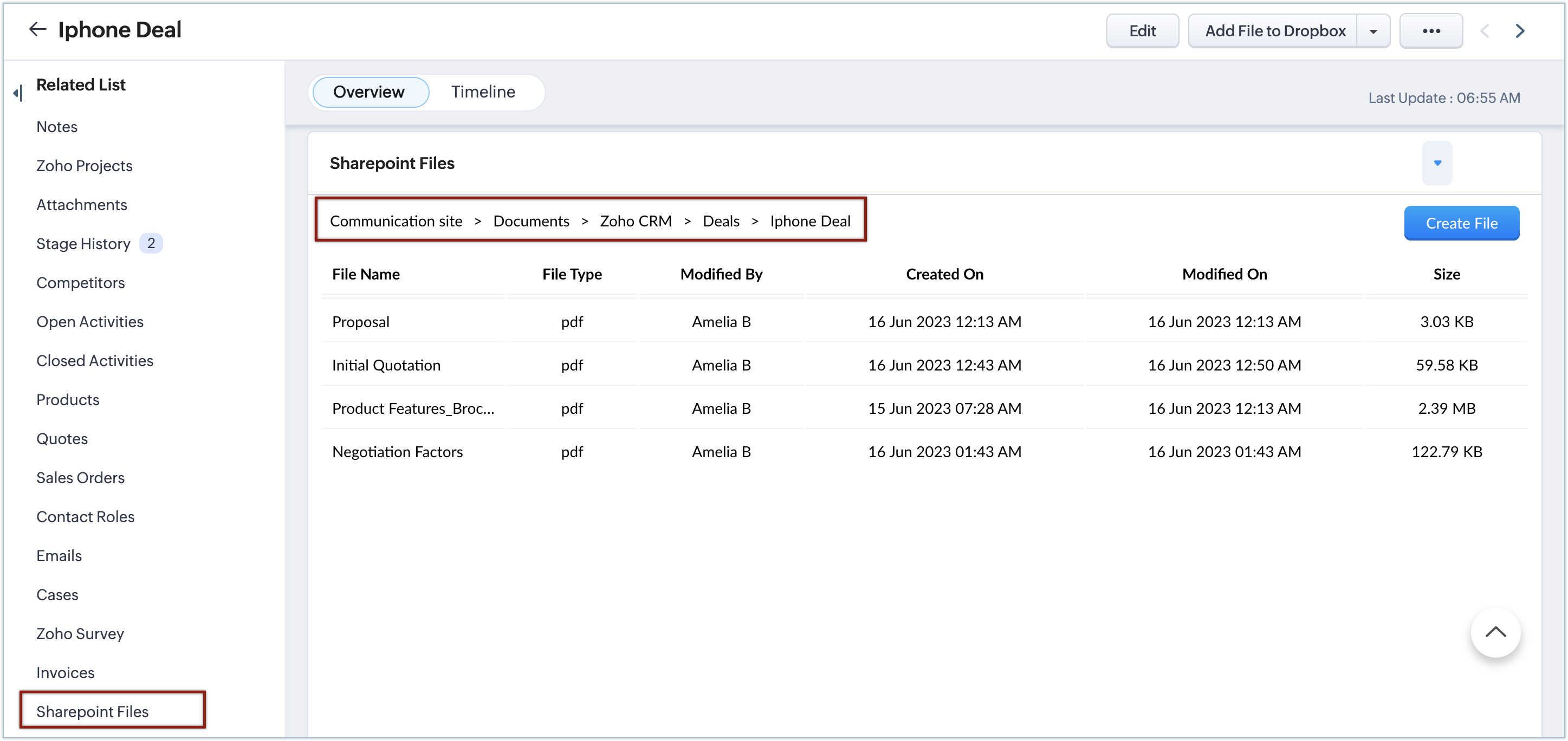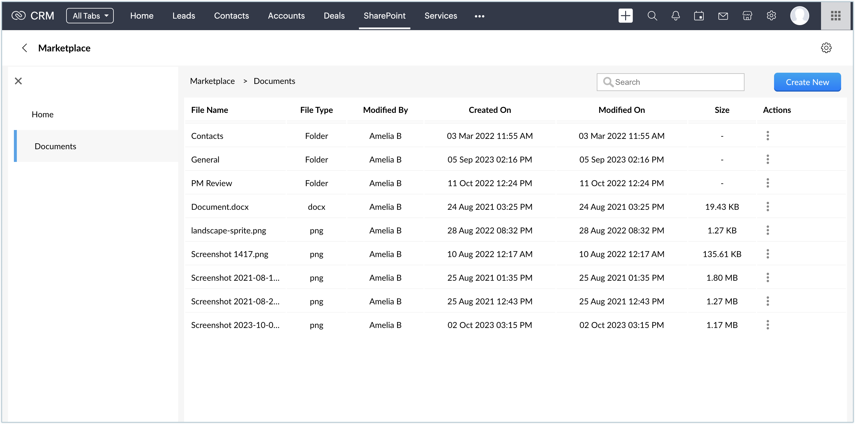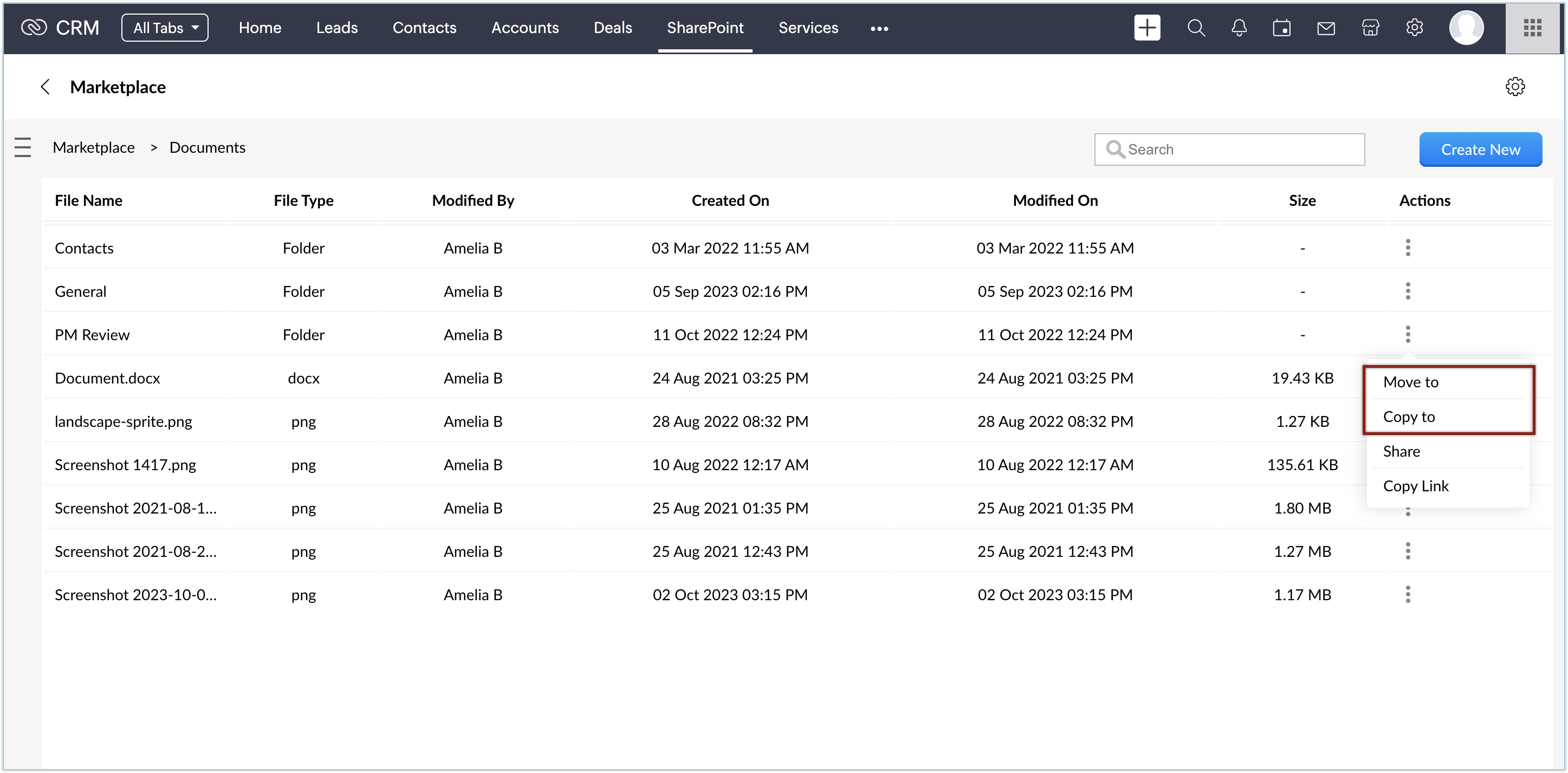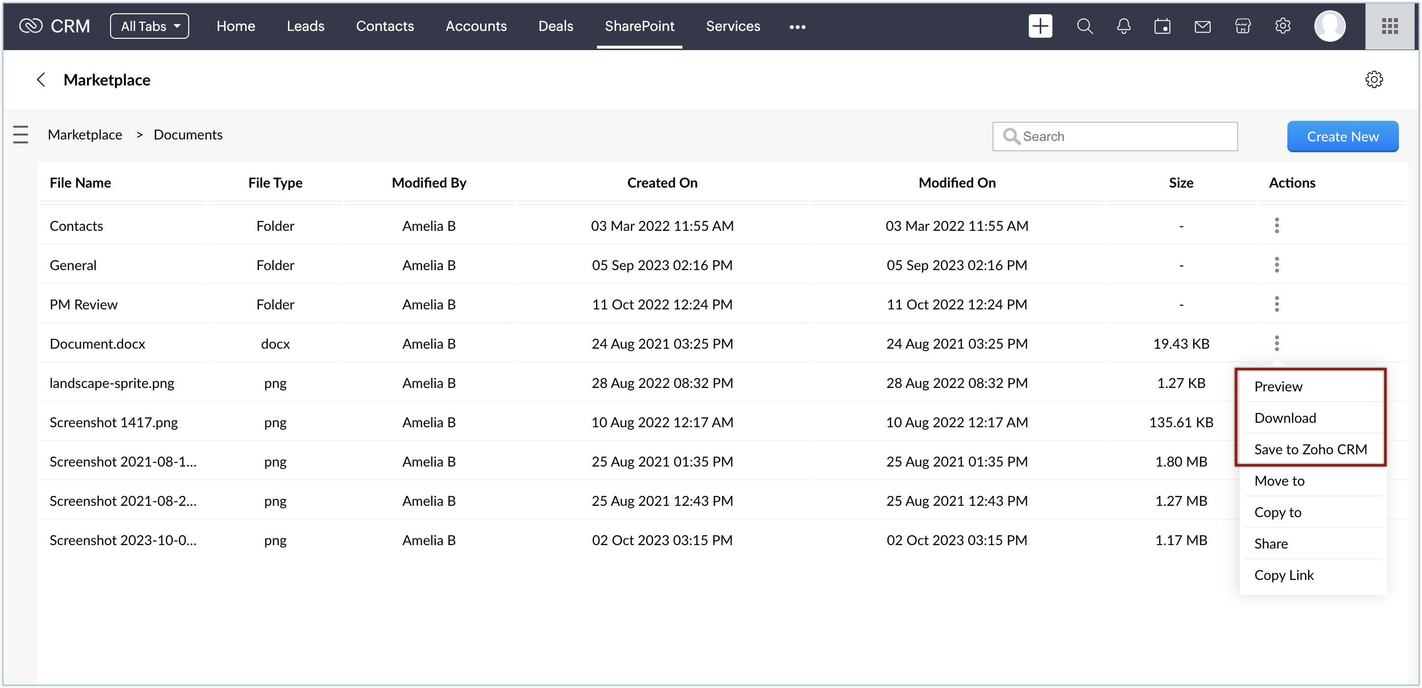 While the data sync brings in SharePoint data to Zoho CRM, you can also create files and folders in SharePoint from within Zoho CRM.