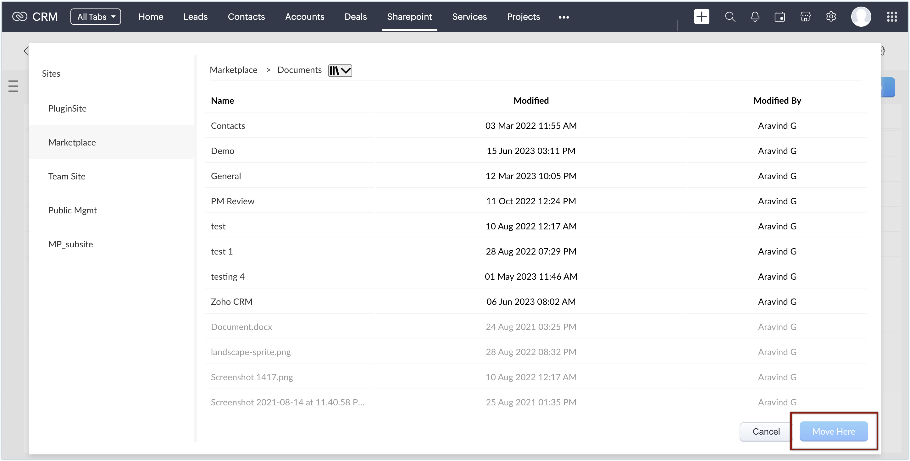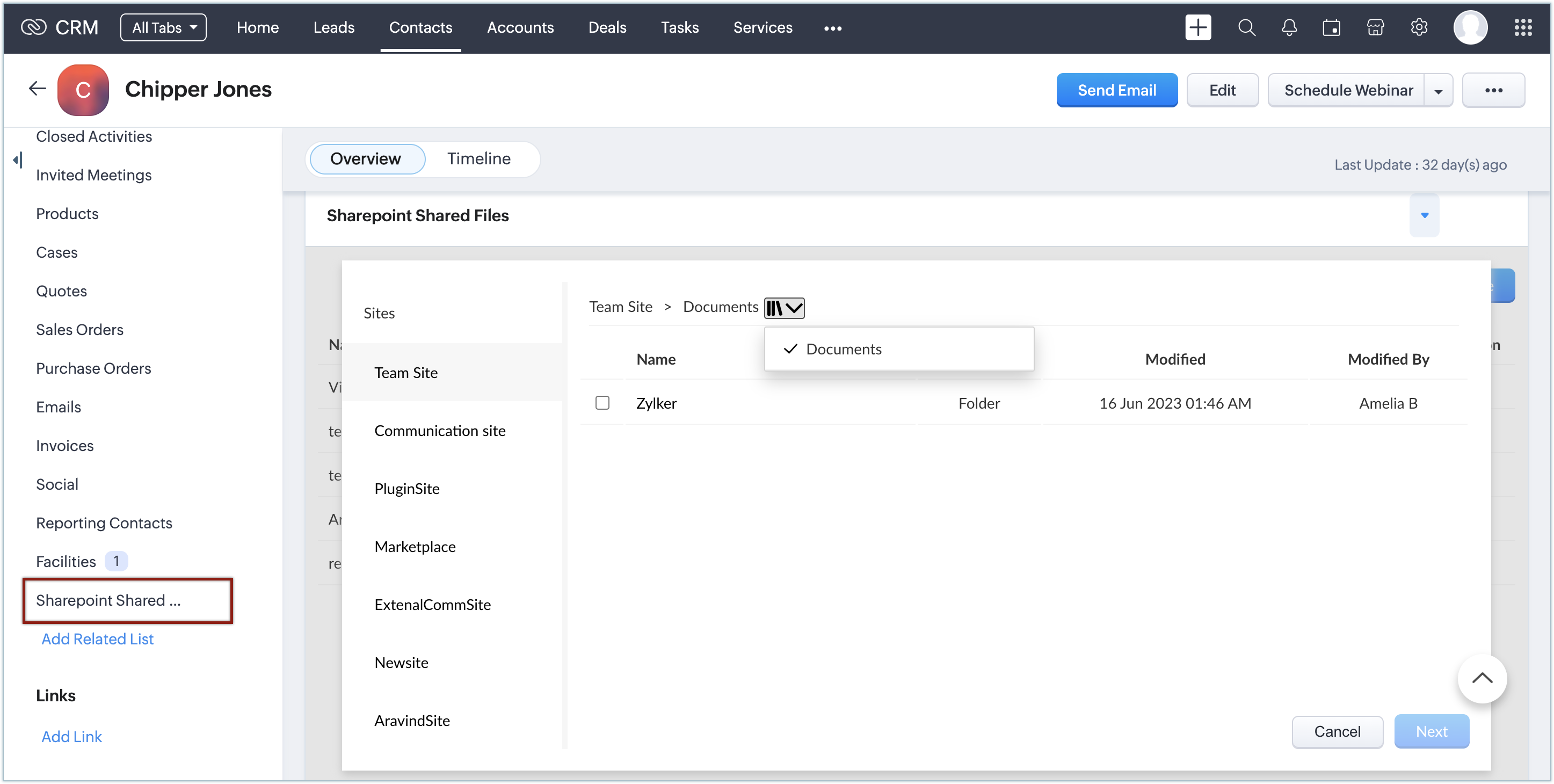 Similarly, for every record of the Contacts, Leads, and Vendors modules, all the files and folders that are shared with that particular record will be listed under its related list SharePoint Shared Files.