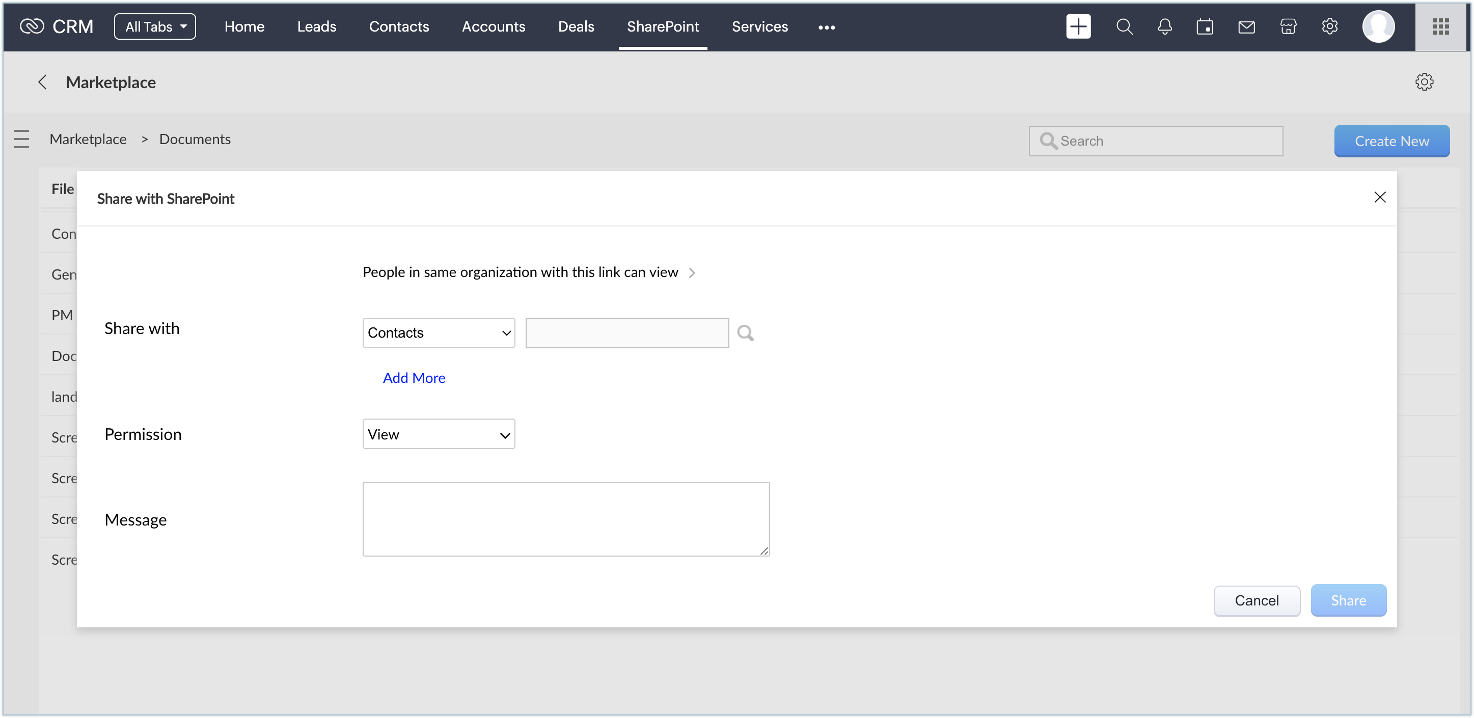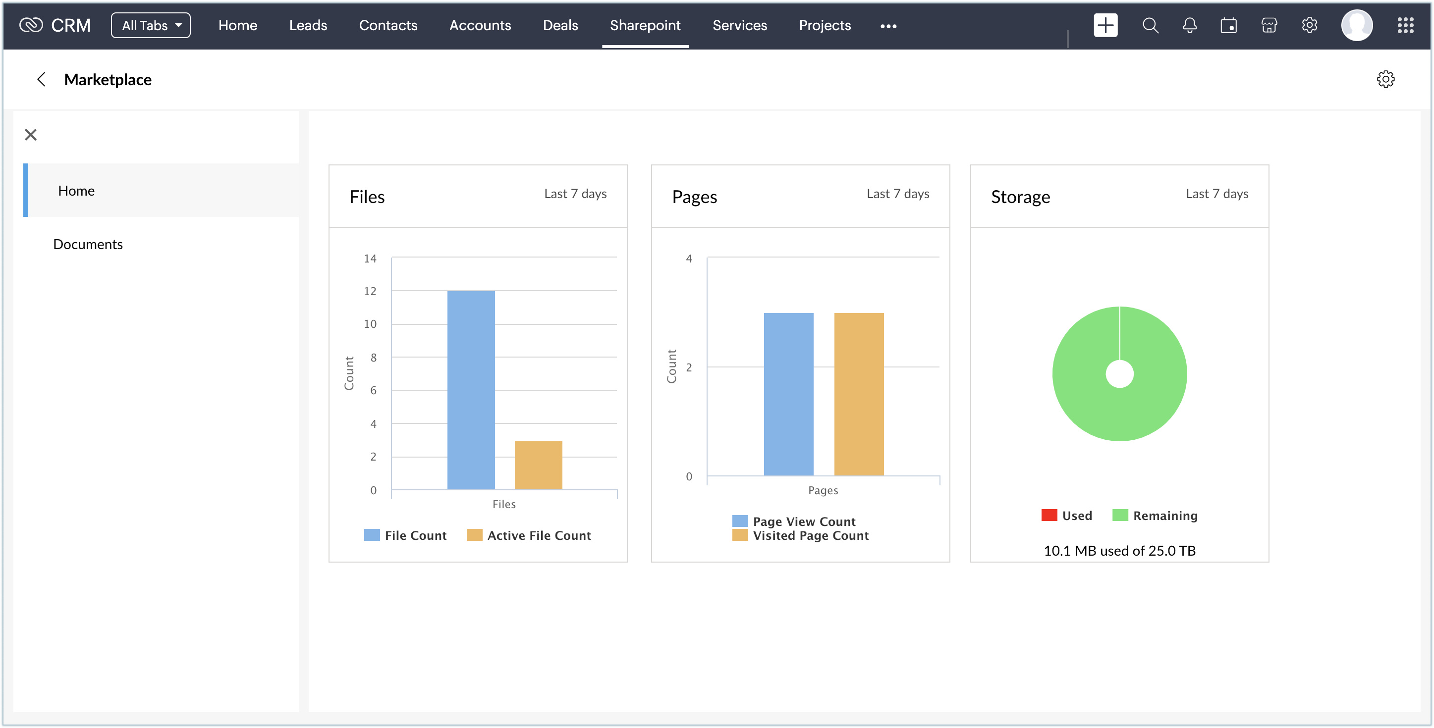 Microsoft SharePoint is a document management tool that enables you to share and manage content, and thereby collaborate easily and securely with members both inside and outside your organization. With the SharePoint extension for Zoho CRM, you can access, manage, and organize your SharePoint libraries from within Zoho CRM. You can also create customized folders for your Zoho CRM records in SharePoint libraries, where you can store files related to your deals and accounts and share those files and folders securely with your contacts, leads, and vendors.