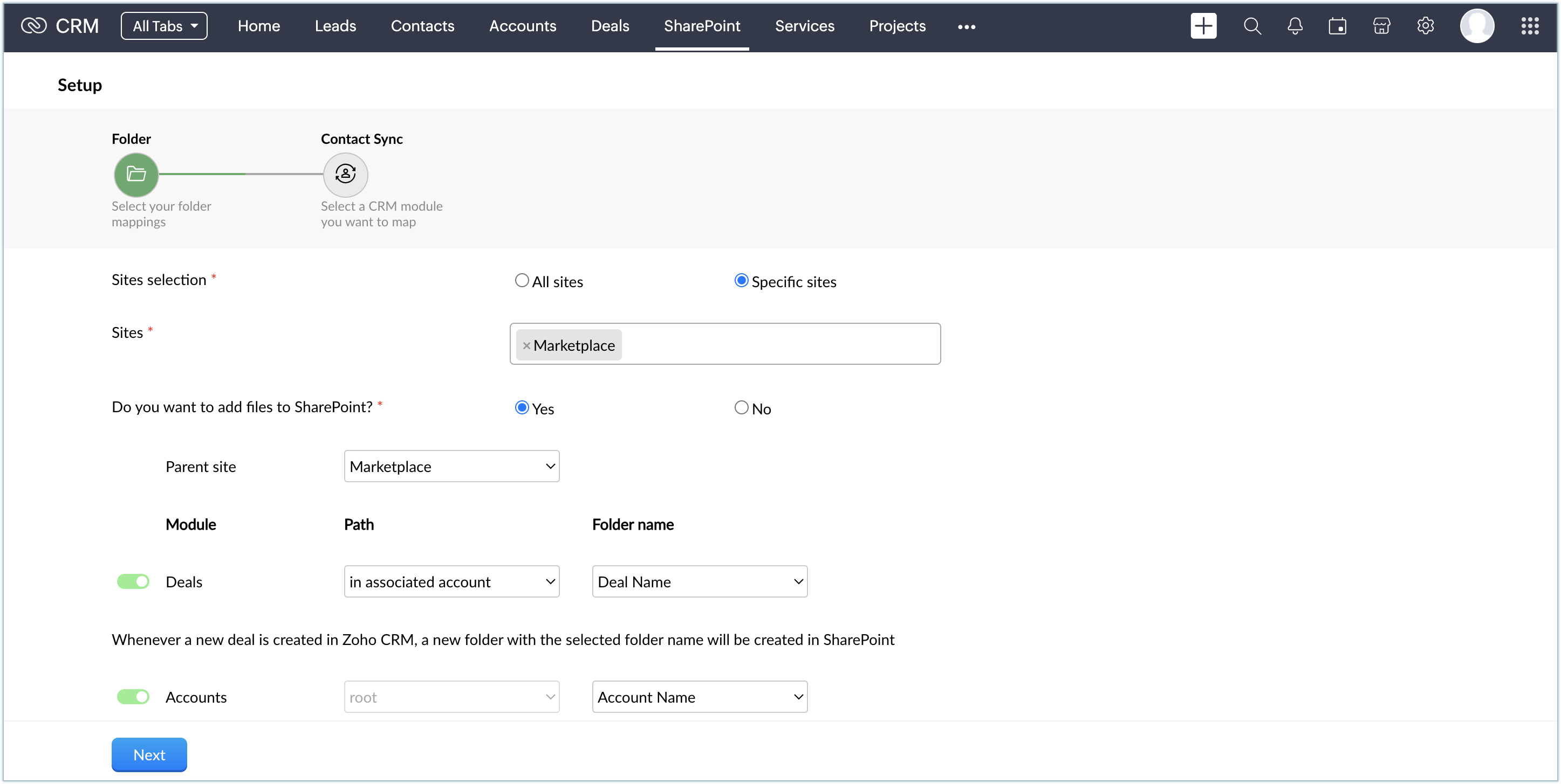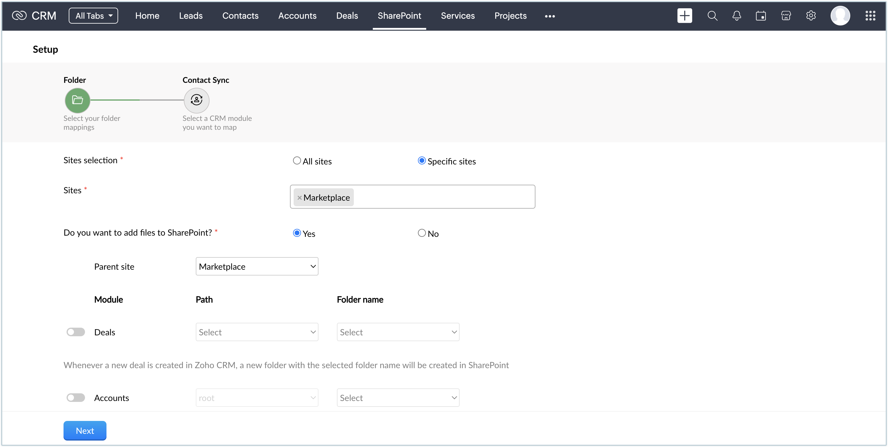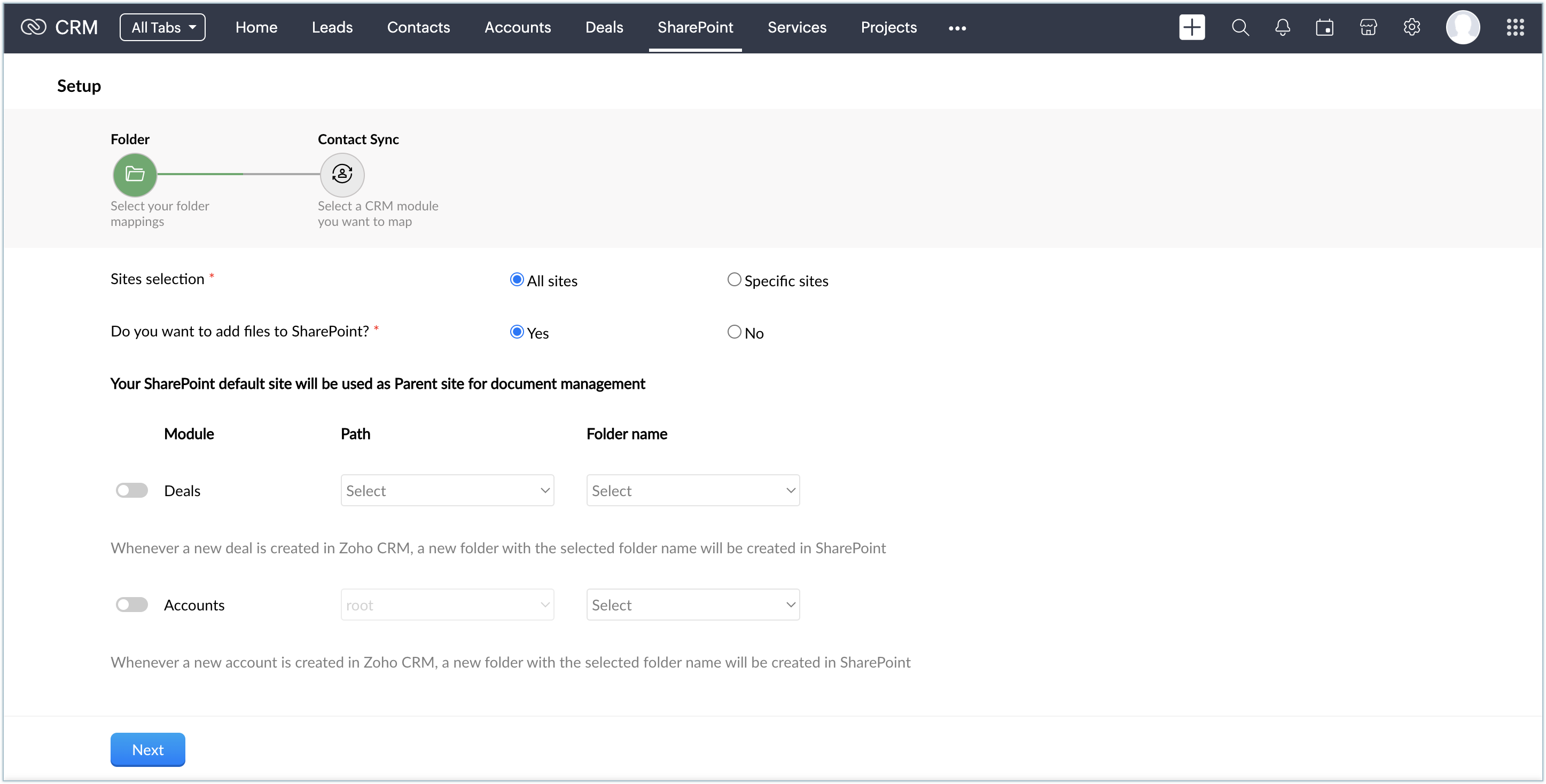 Next, choose Yes or No to manage SharePoint libraries for specific modules of Zoho CRM records.