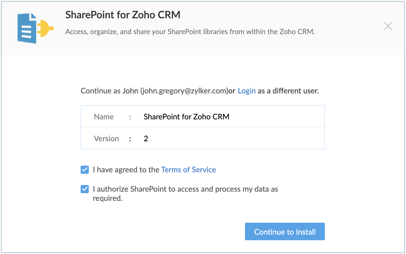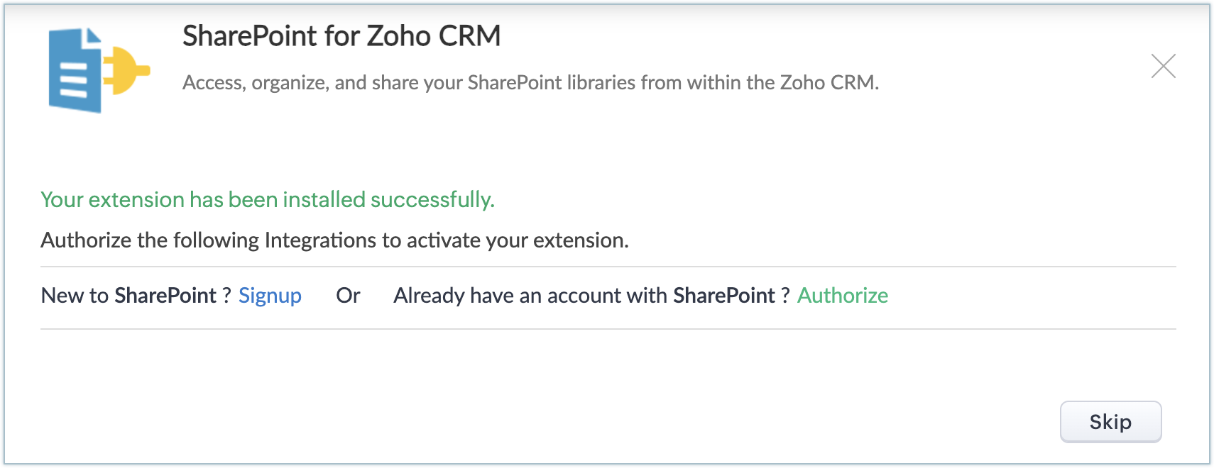You can install the SharePoint extension either from the Zoho Marketplace or from within your Zoho CRM account.