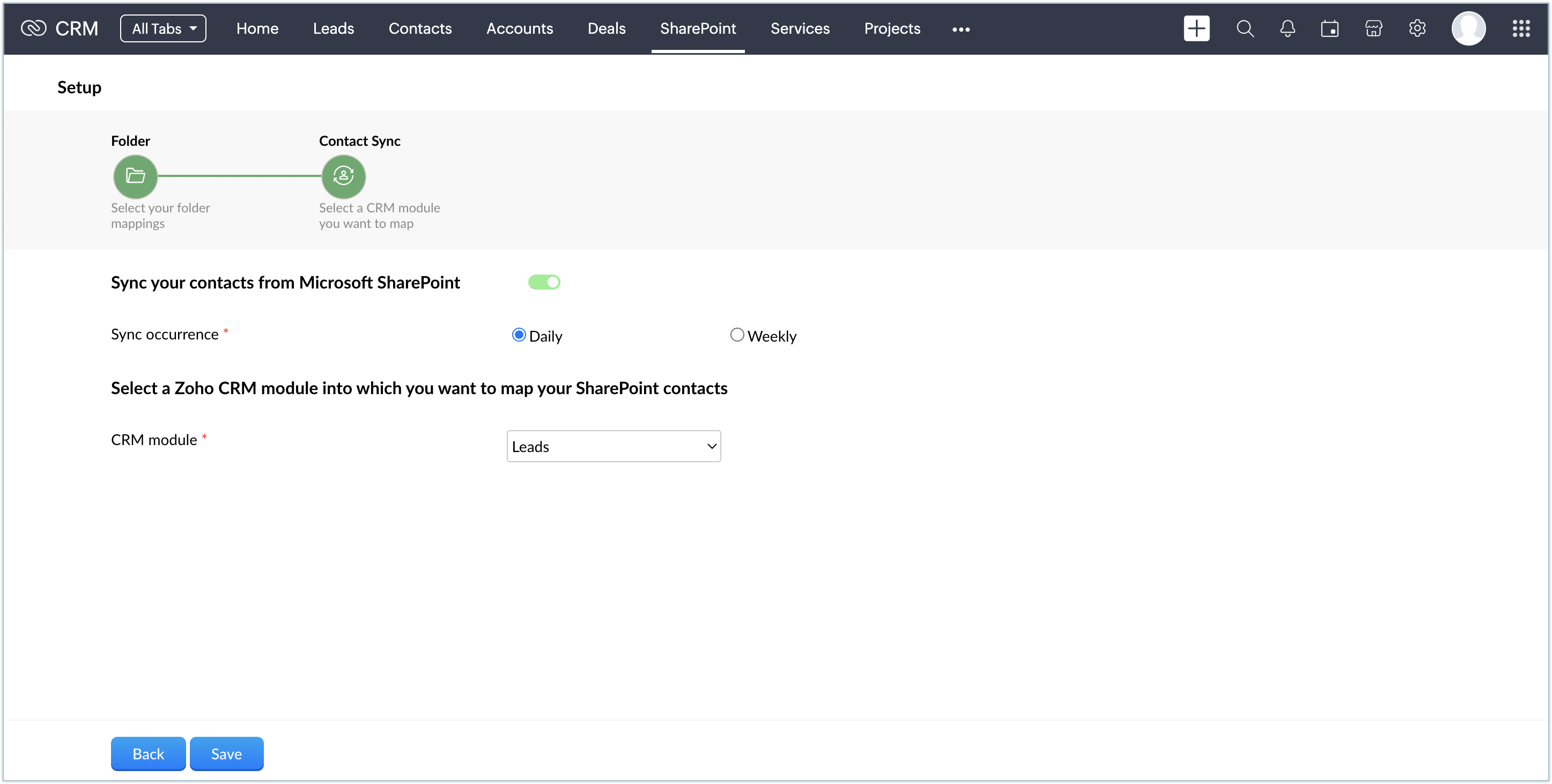 In the Contact Sync section of the Setup page, toggle ON to synchronize the contacts from SharePoint to Zoho CRM.