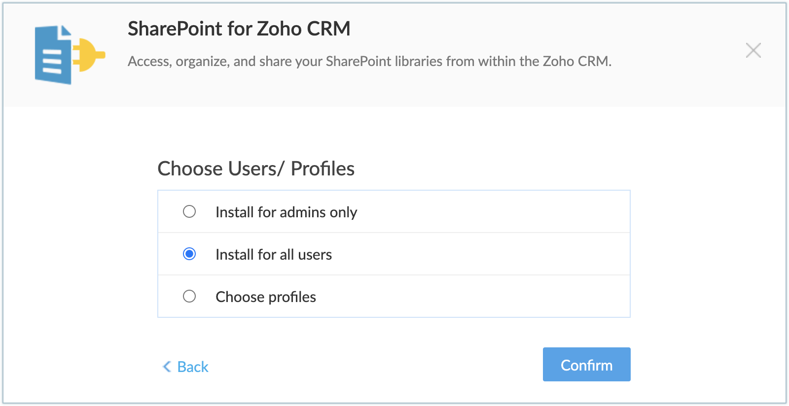 Choose profiles - The extension will be installed in CRM for manually chosen users. Choose this option, click Confirm, then select the desired profiles.