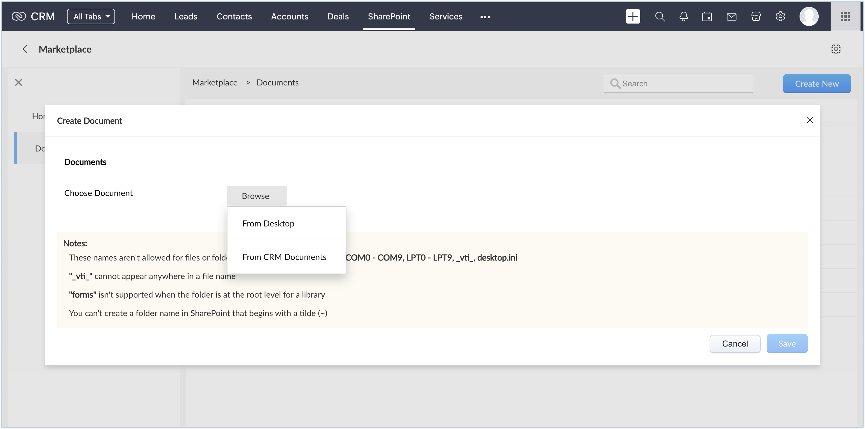 Choose files from your desktop or from Zoho CRM's Documents module and upload them to the specified folder. Click Save.