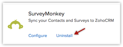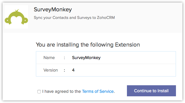 Zoho Marketplace and install the SurveyMonkey extension or log in to your Zoho CRM account and install.