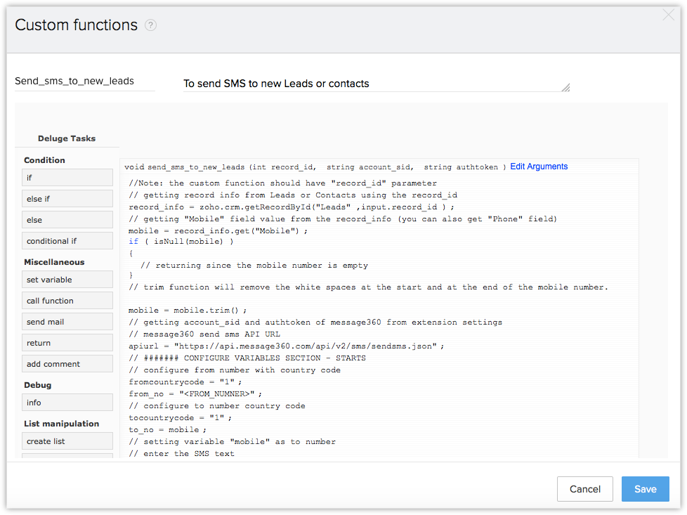 Users who can also send messages to your new contacts using the Ytel integration. This can be accomplished through workflow custom functions in CRM. Write your own custom function using our Deluge script editor in your CRM and associate it with the workflow rule. See Also: Deluge Script Reference guide