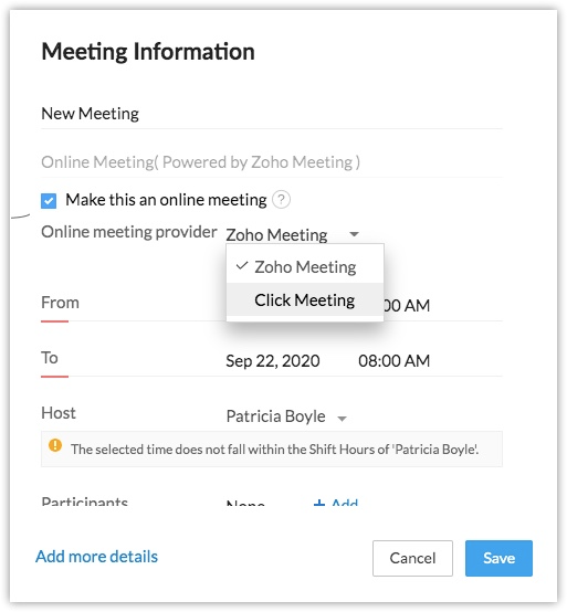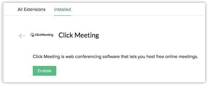 Click Meeting is a web conferencing software which allows you to set up an online meeting with remote participants. Integrating Click Meeting with your Zoho CRM account will allow you to create online meetings from Zoho CRM itself. When you create online meetings from CRM, Click Meeting will automatically create a record of the meeting in the Meetings module.