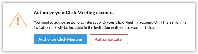 Once the integration is enabled, you can create a meeting through the Calendar or the Meetings module in Zoho CRM. Every CRM user will be prompted to authorize their Click Meeting account when they use the integration for the first time. Without authorization, the user cannot use the Click Meeting integration.