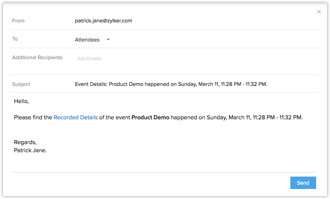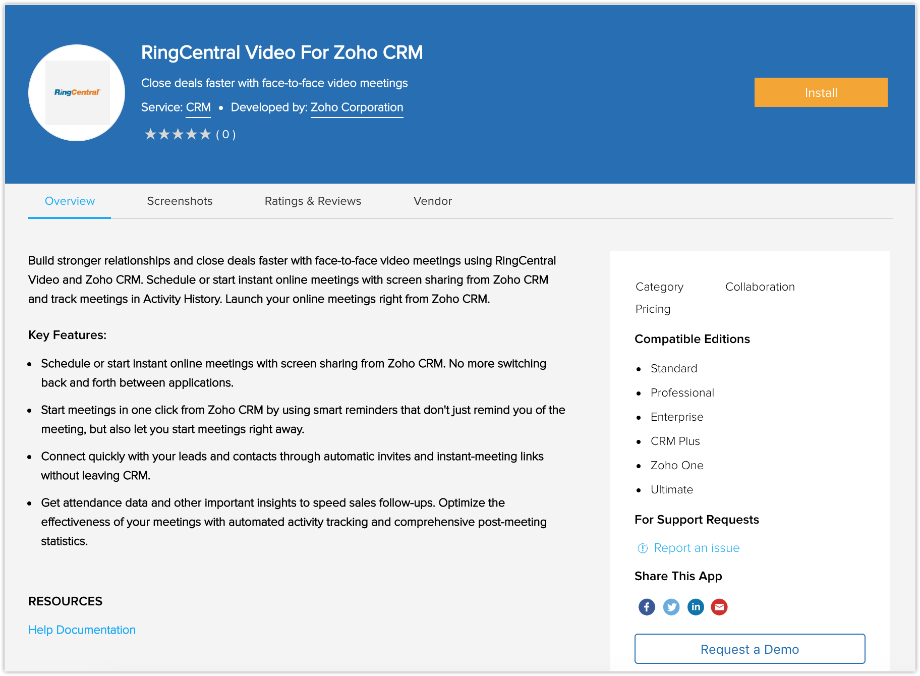 Zoho CRM lets you integrate with RingCenral Video, a web conferencing solution to conduct online meetings. Once the extension is set up, the events or meetings can be conducted right from your CRM account. Moreover, you will be able to view the number of attendees and share the recording of your event with the attendees.