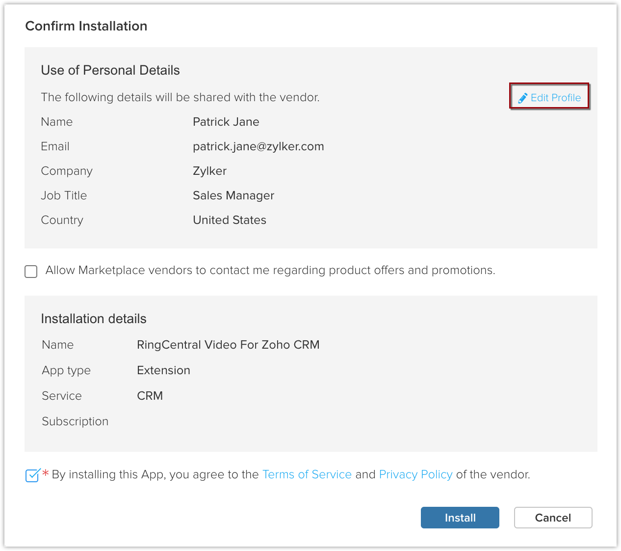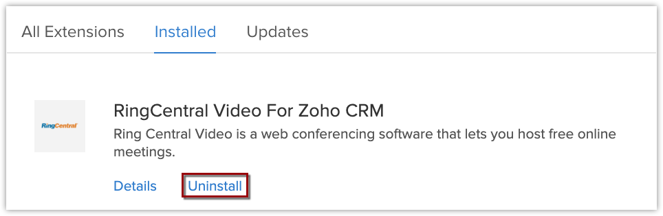 - Click Uninstall against RingCentral Video for Zoho CRM.