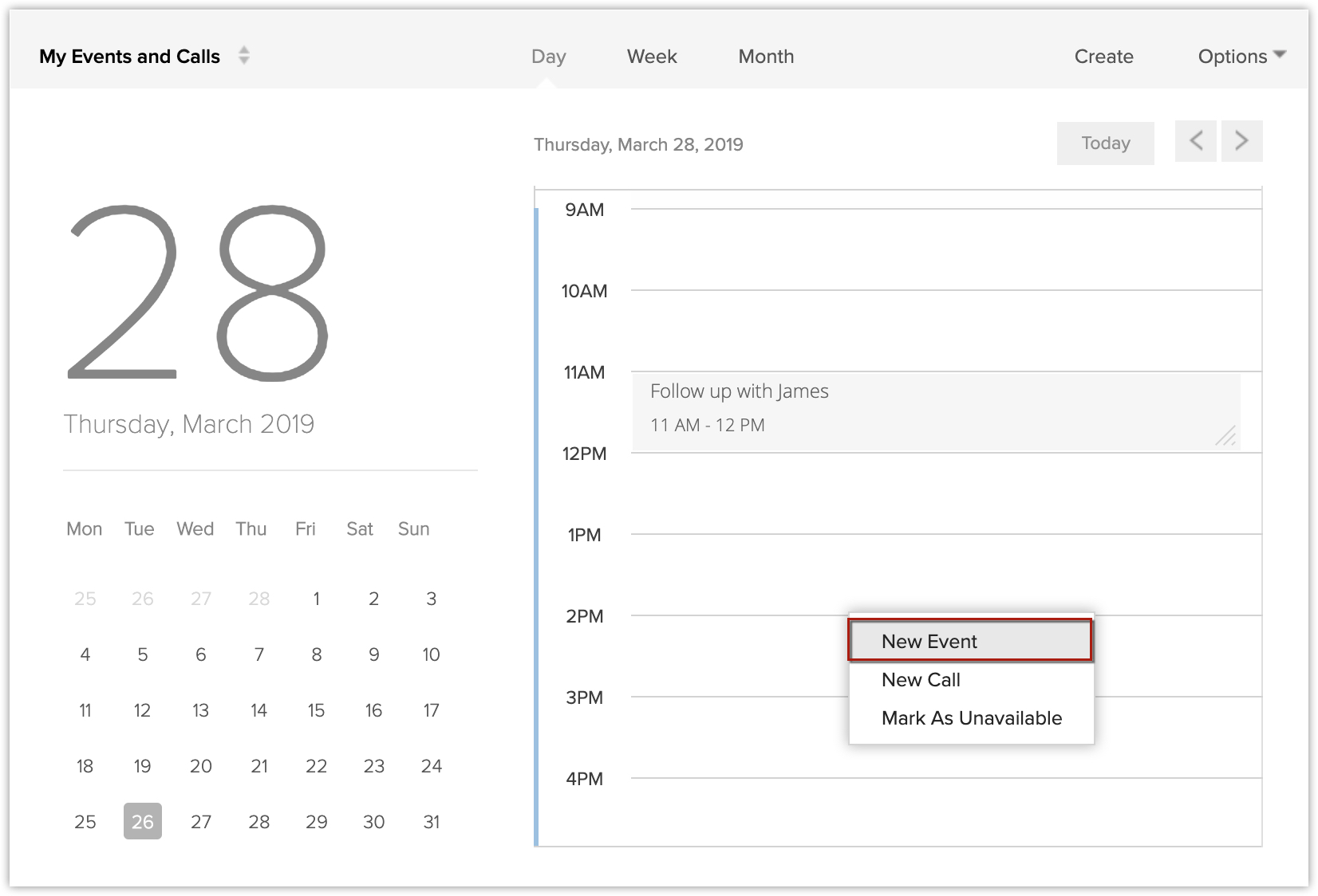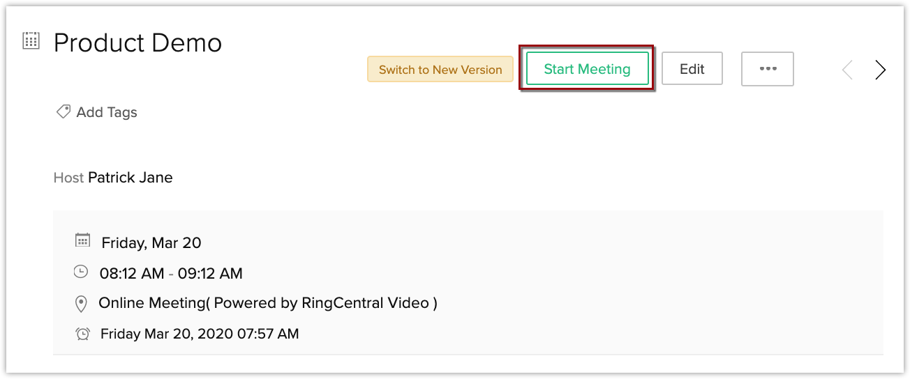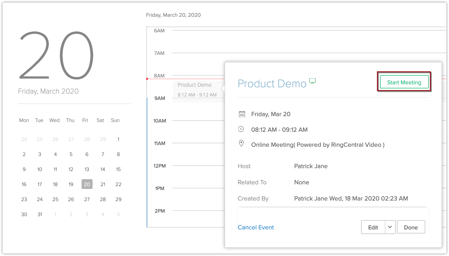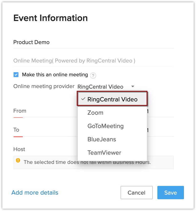Once the extension is enabled, you can create a meeting in RingCentral Video from the Events module in Zoho CRM.