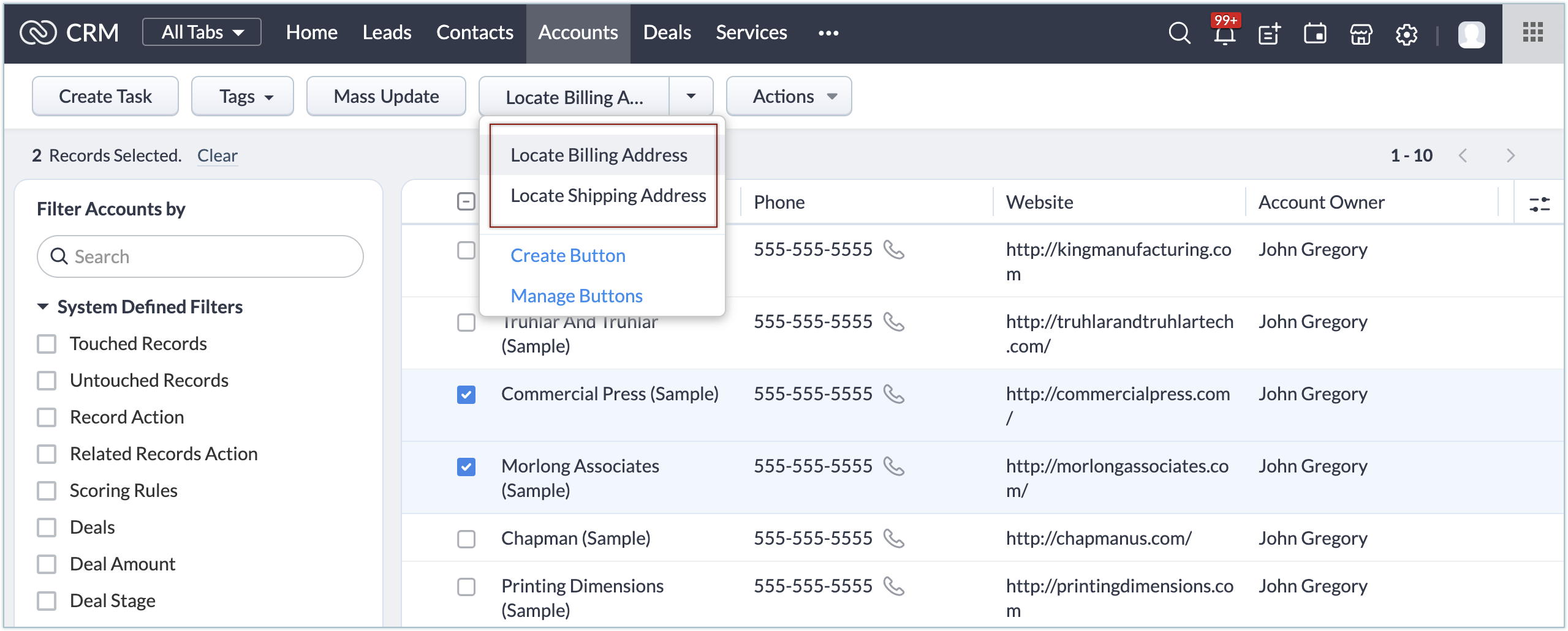 You can locate a single record or multiple records simultaneously from your Zoho CRM using this extension. The records can be from the Leads, Contacts, and Accounts modules. You can locate the records based on the billing address or the shipping address.